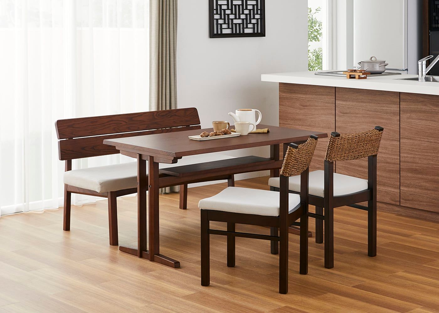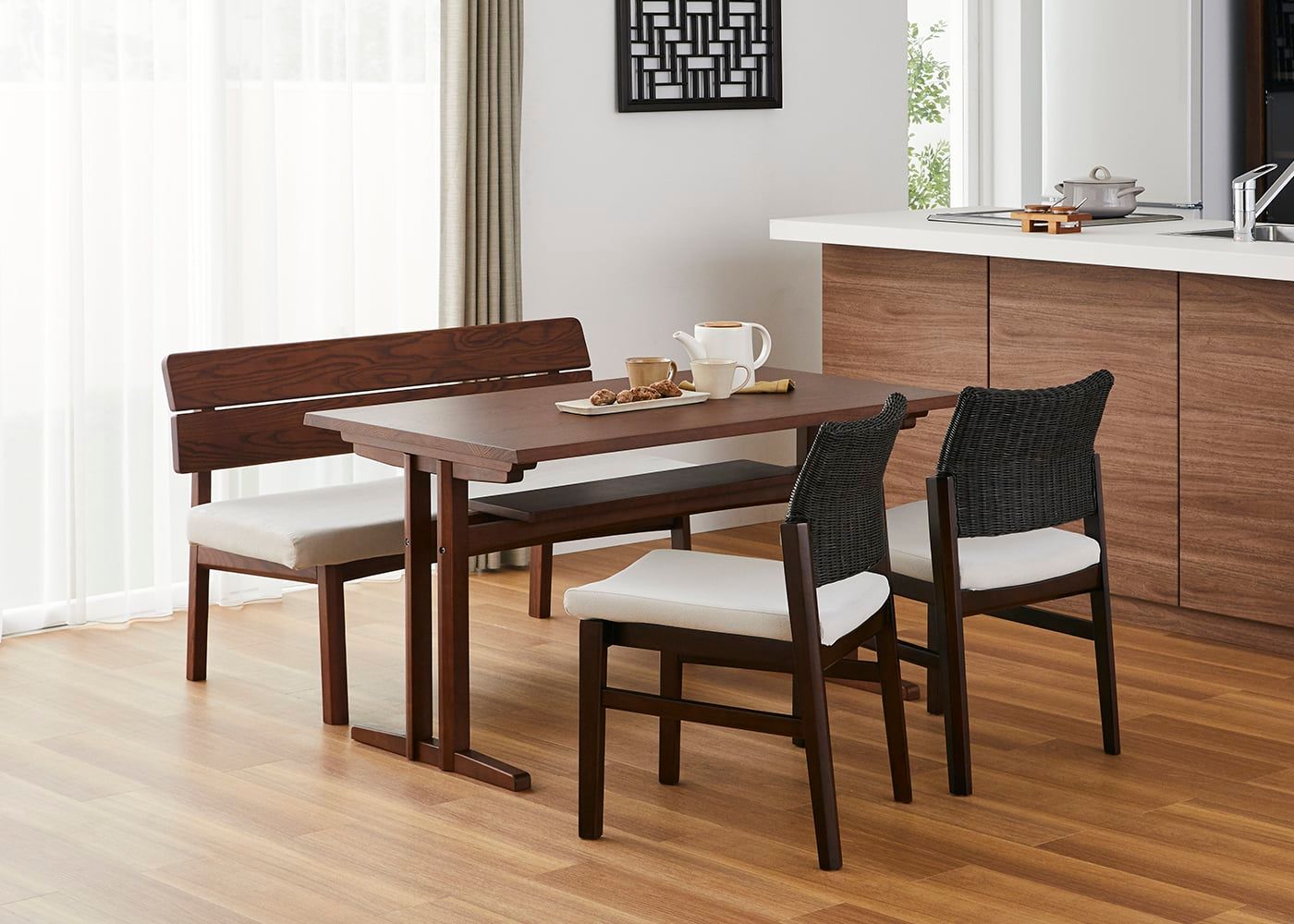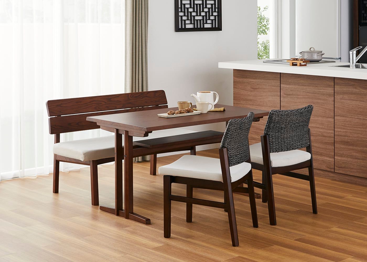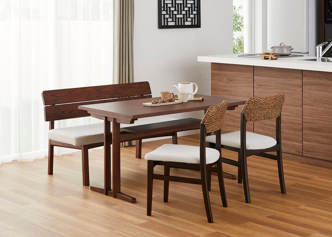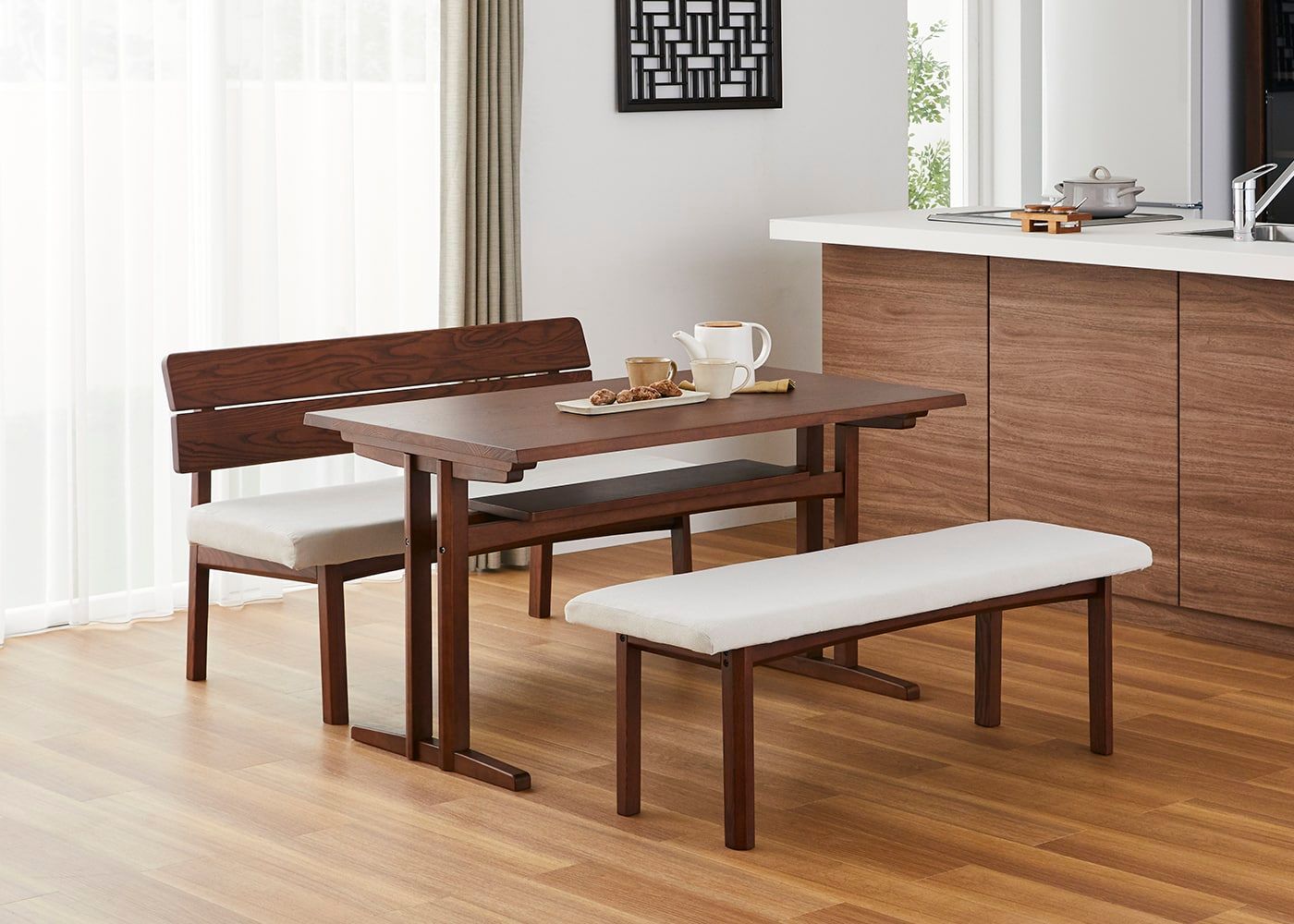 ベンチは座面が広く、大人2人や親子で座ったり、1人の時は贅沢に幅いっぱい使って広々座ることも。こんなダイニングで自由気ままにくつろいでみては。お好みの椅子とのセットをお選び下さい。
