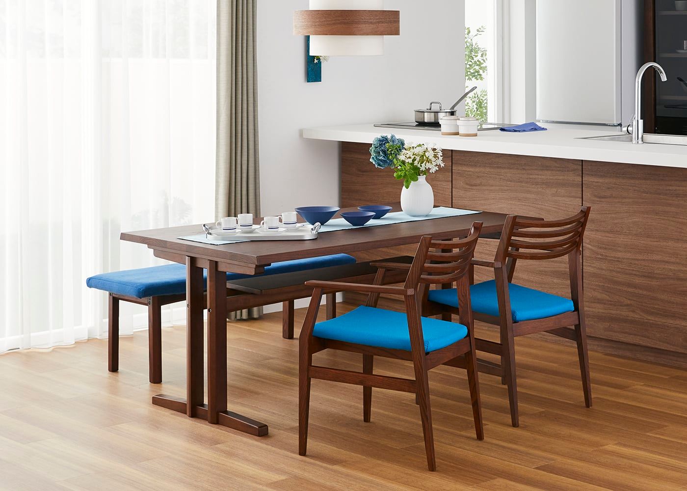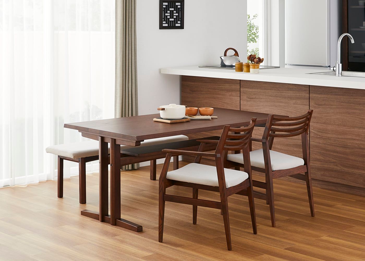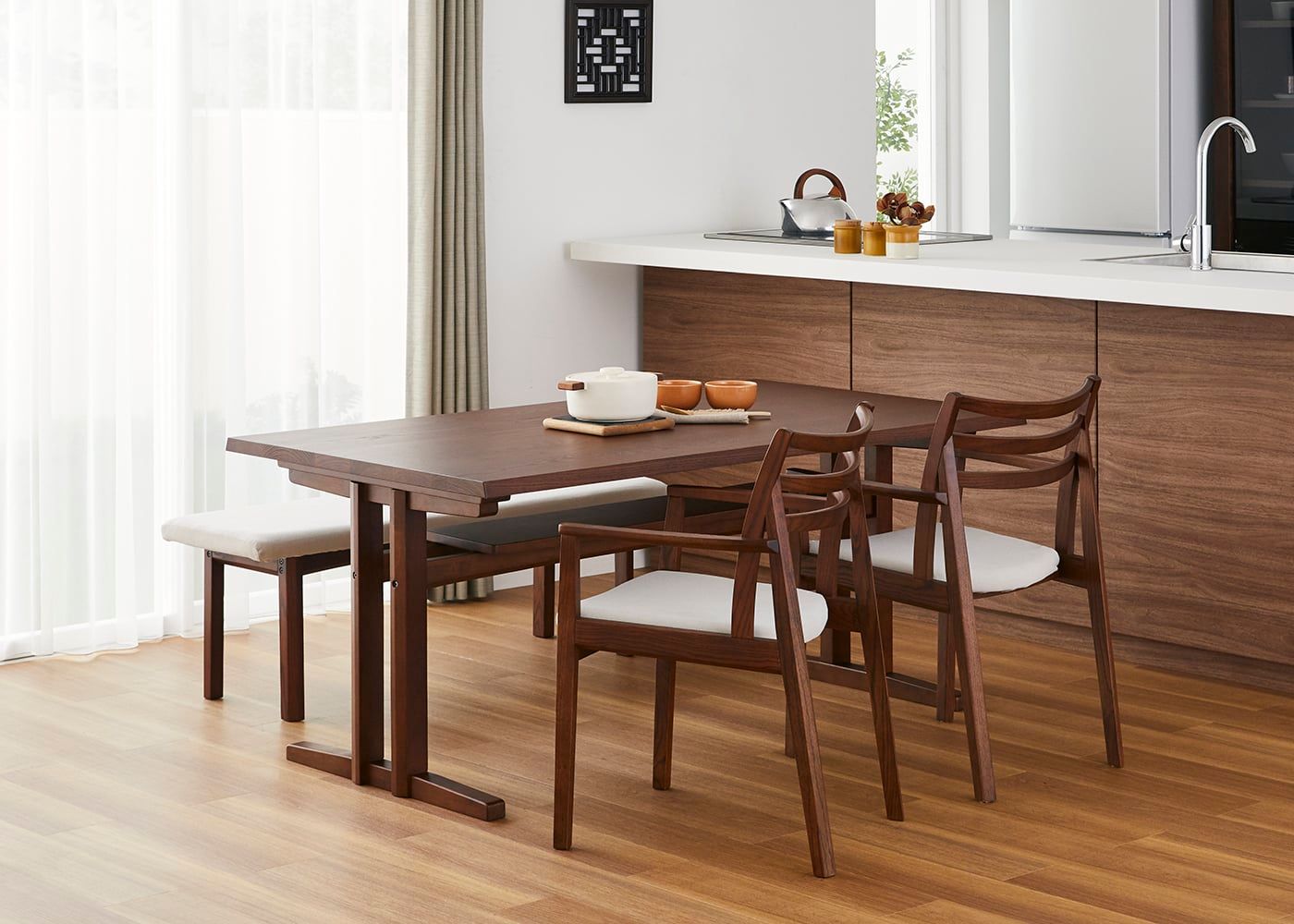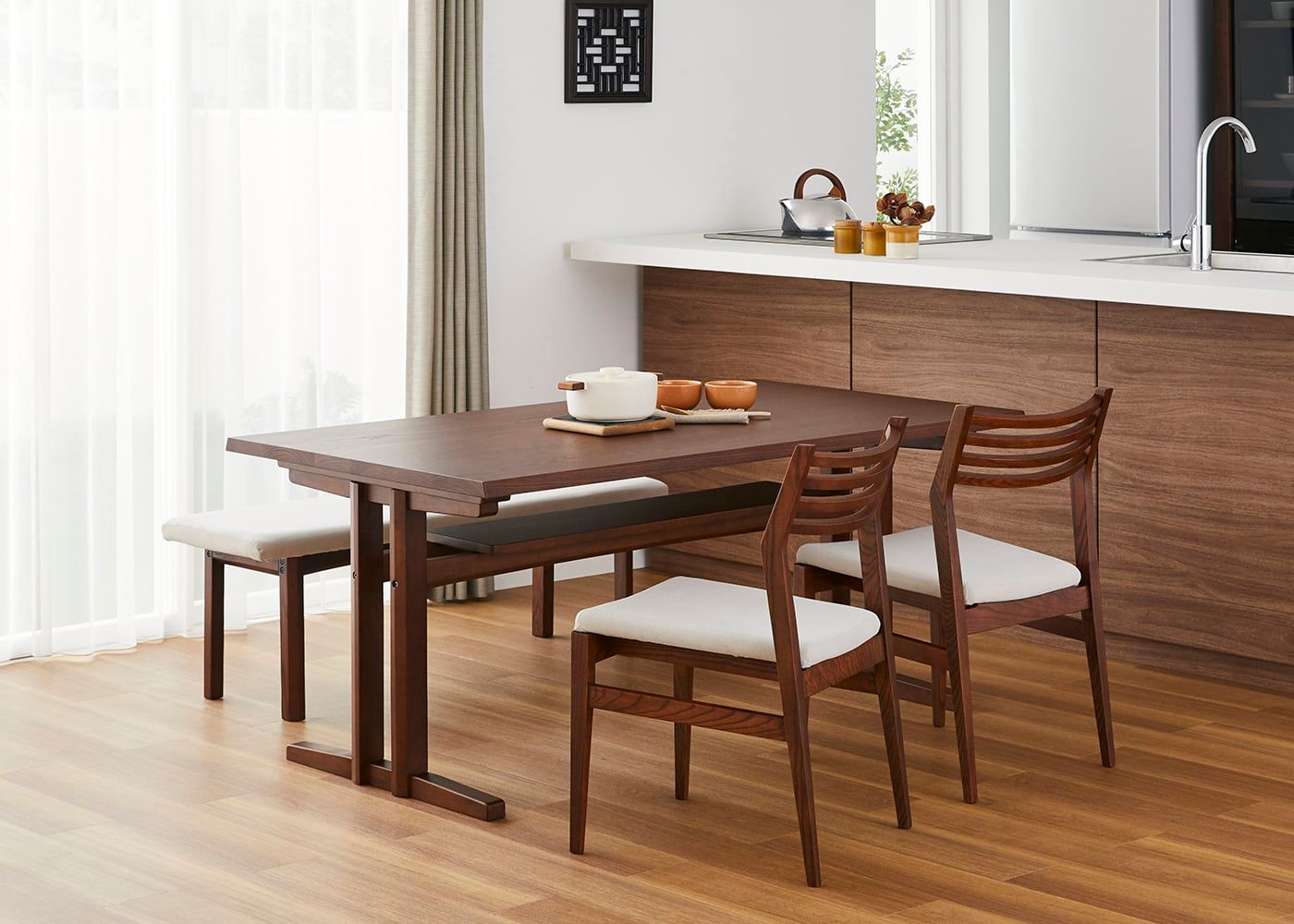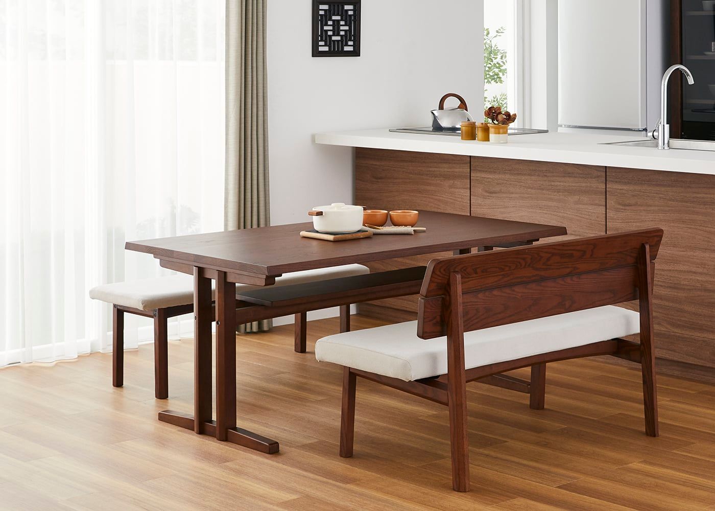ベンチは座面が広く、大人2人や親子で座ったり、1人の時は贅沢に幅いっぱい使って広々座ることも。こんなダイニングで自由気ままにくつろいでみては。お好みの椅子とのセットをお選び下さい。