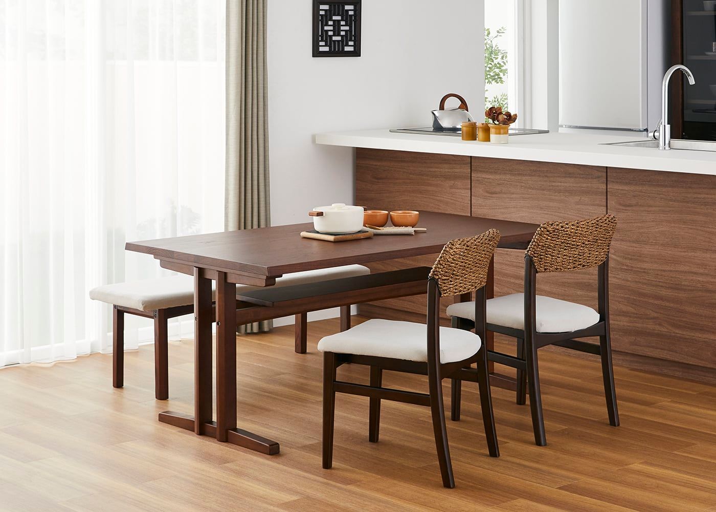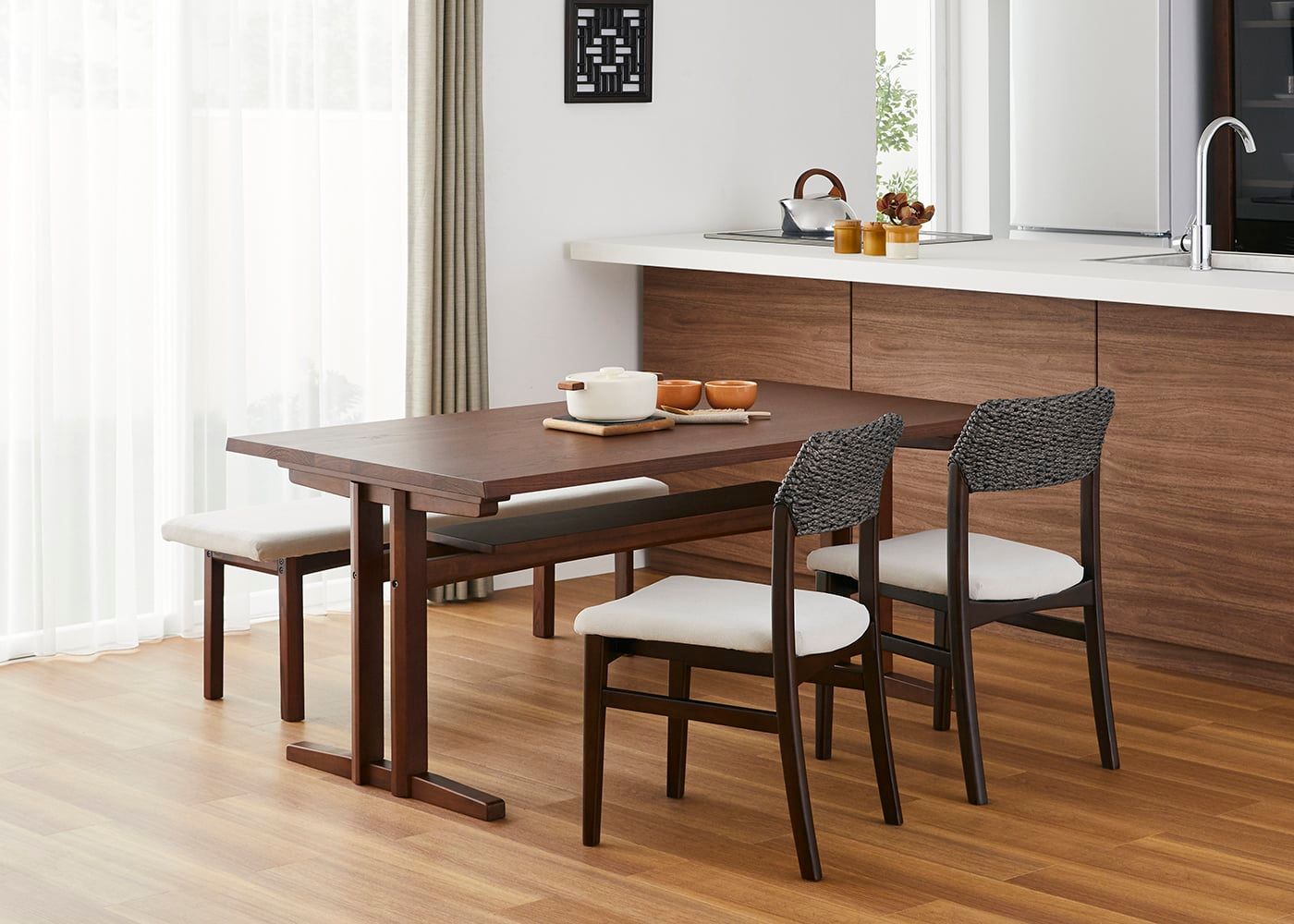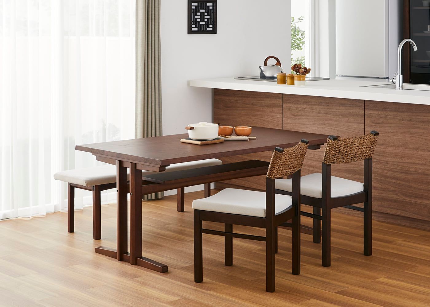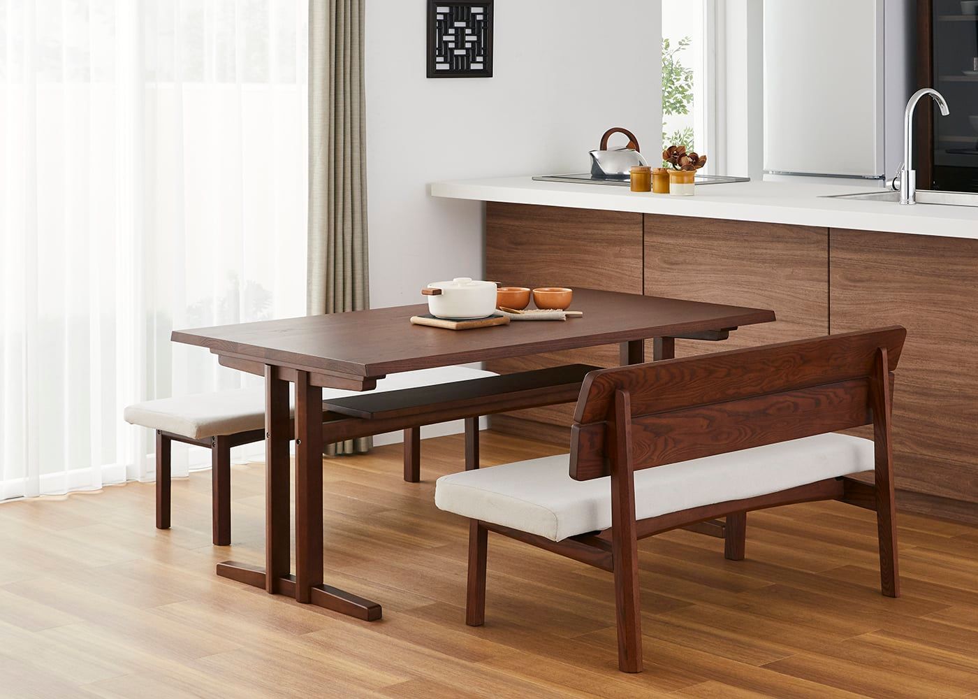 ベンチは座面が広く、大人2人や親子で座ったり、1人の時は贅沢に幅いっぱい使って広々座ることも。こんなダイニングで自由気ままにくつろいでみては。お好みの椅子とのセットをお選び下さい。