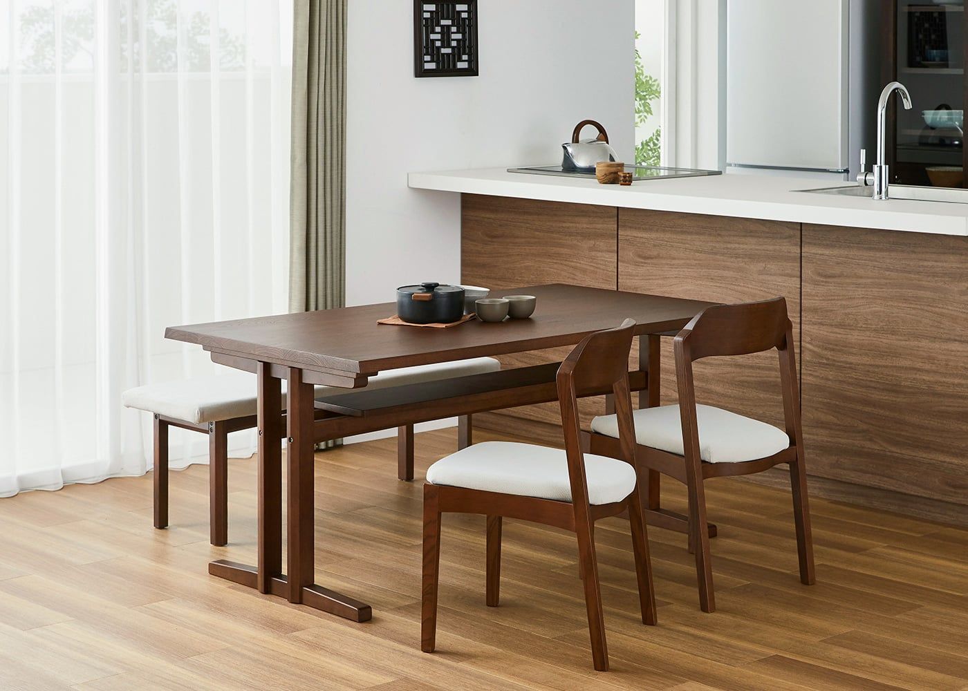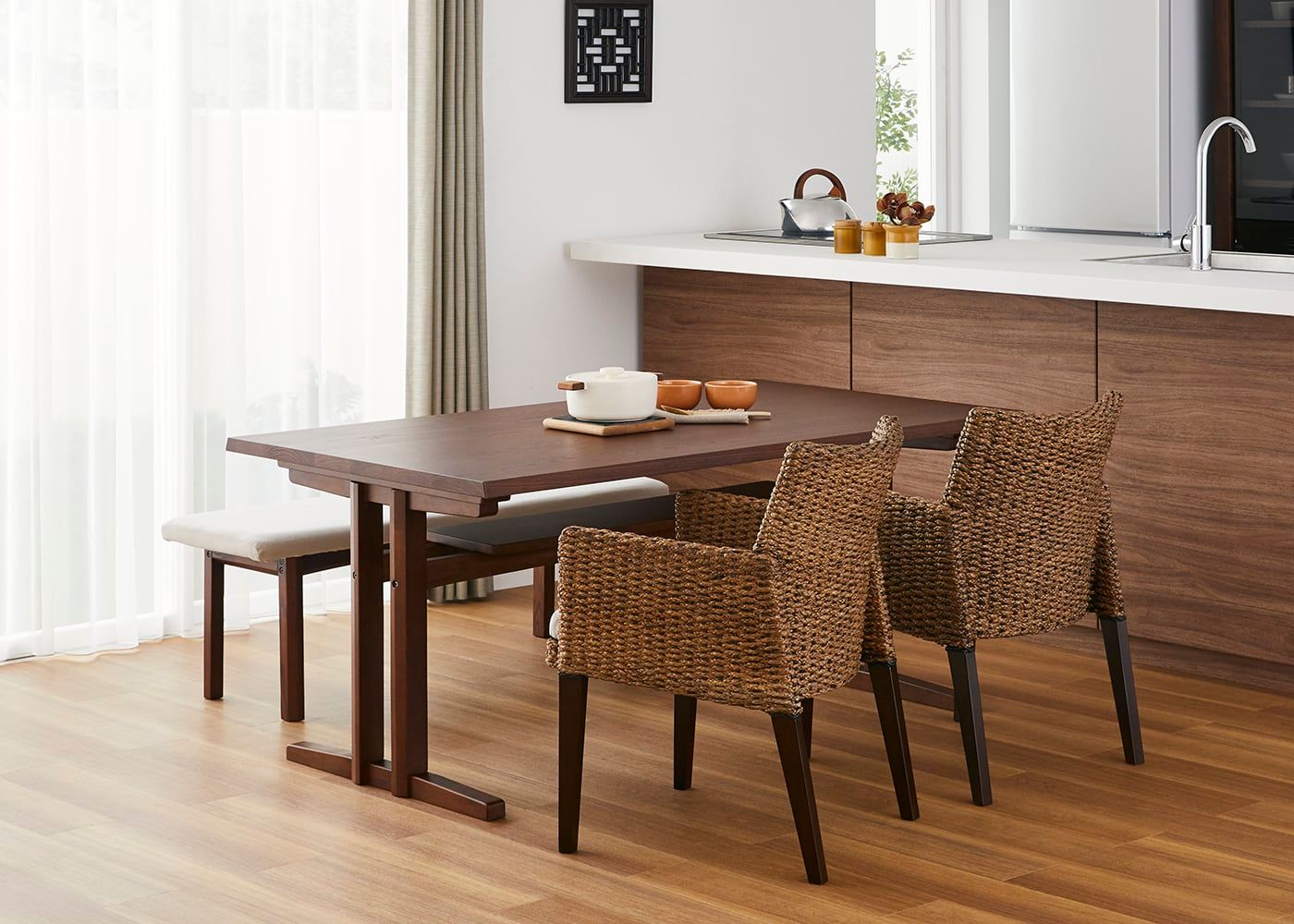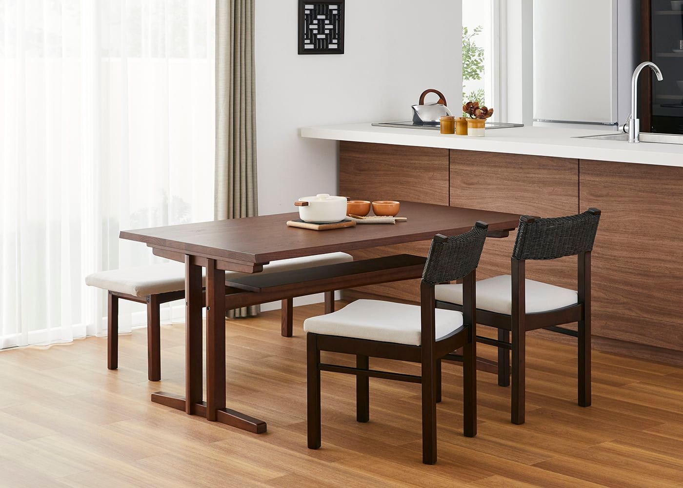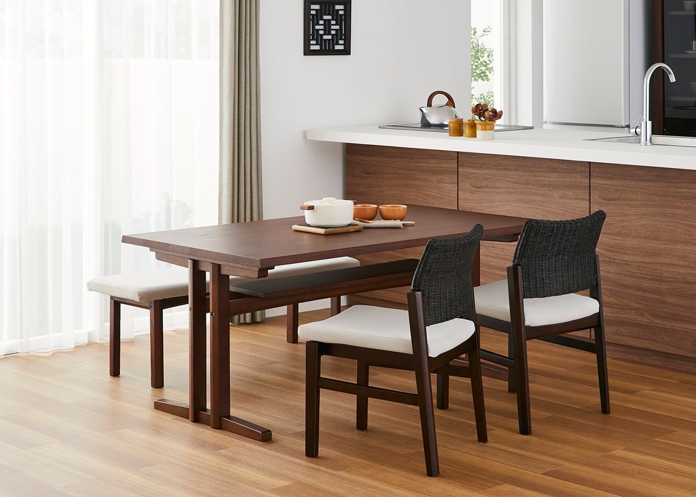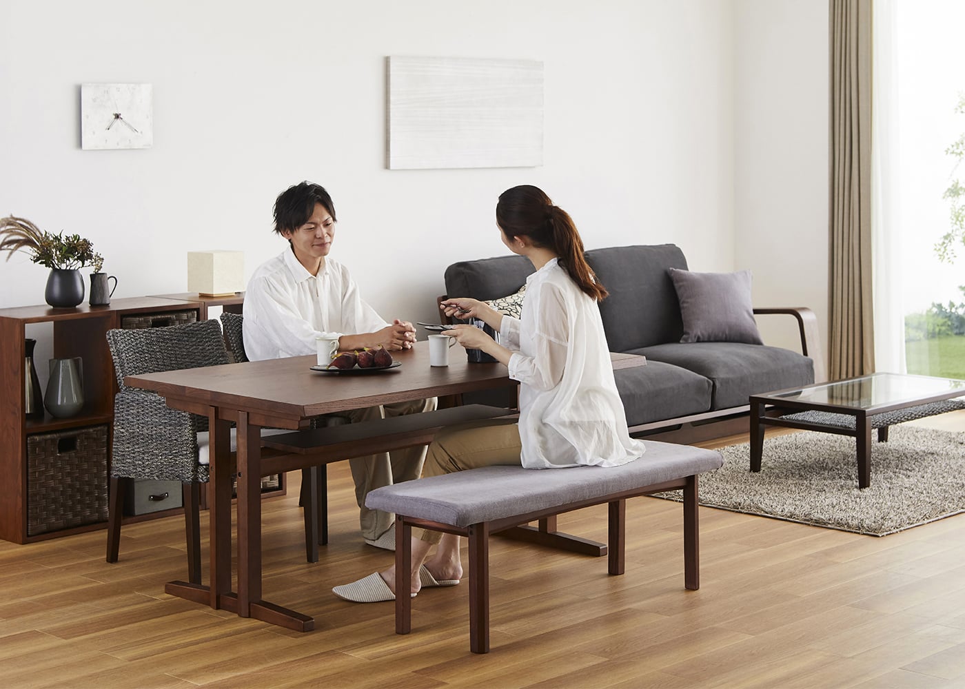 ベンチは座面が広く、大人2人や親子で座ったり、1人の時は贅沢に幅いっぱい使って広々座ることも。こんなダイニングで自由気ままにくつろいでみては。お好みの椅子とのセットをお選び下さい。