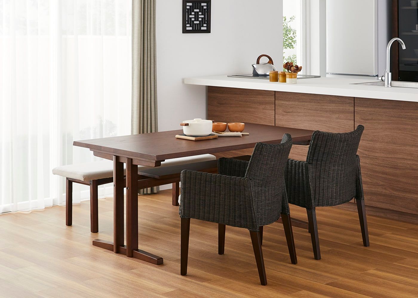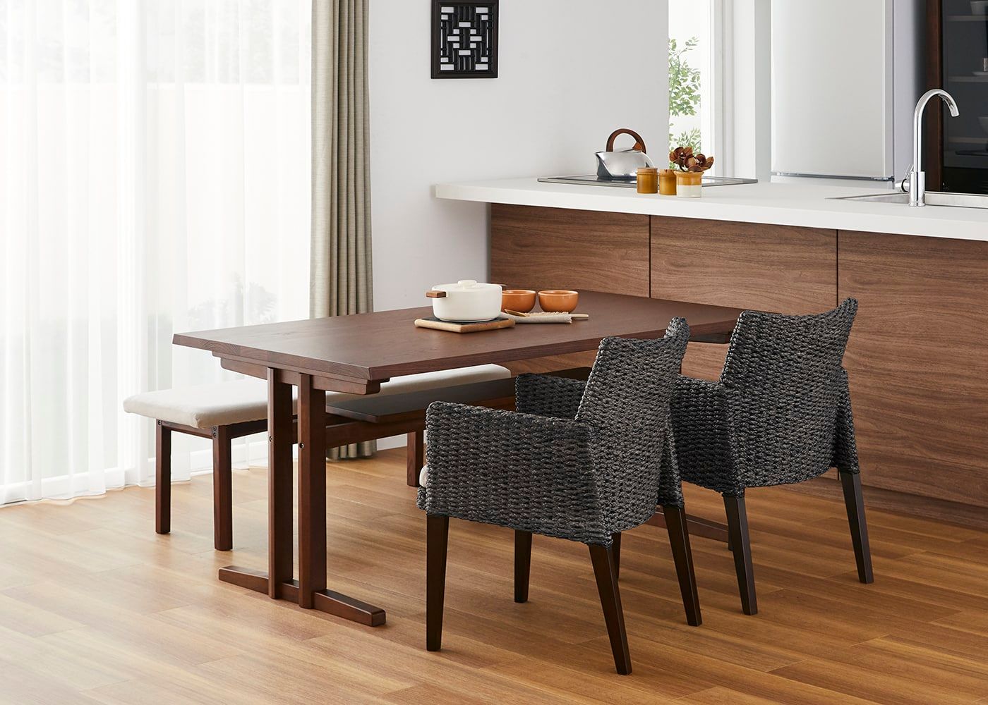 モク・ローダイニングテーブル 1500 (GB)とお好みの椅子やベンチを選んで、リビングダイニングでの日々の暮らしを充実させてみては?(写真はベンチv01(GB)ムン・ダイニングアームチェア (ヒヤシンスDG)のセット例)