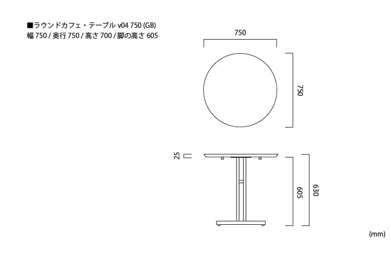 幅750 / 奥行750 / 高さ630 / 脚の高さ605 ※単位は mm
