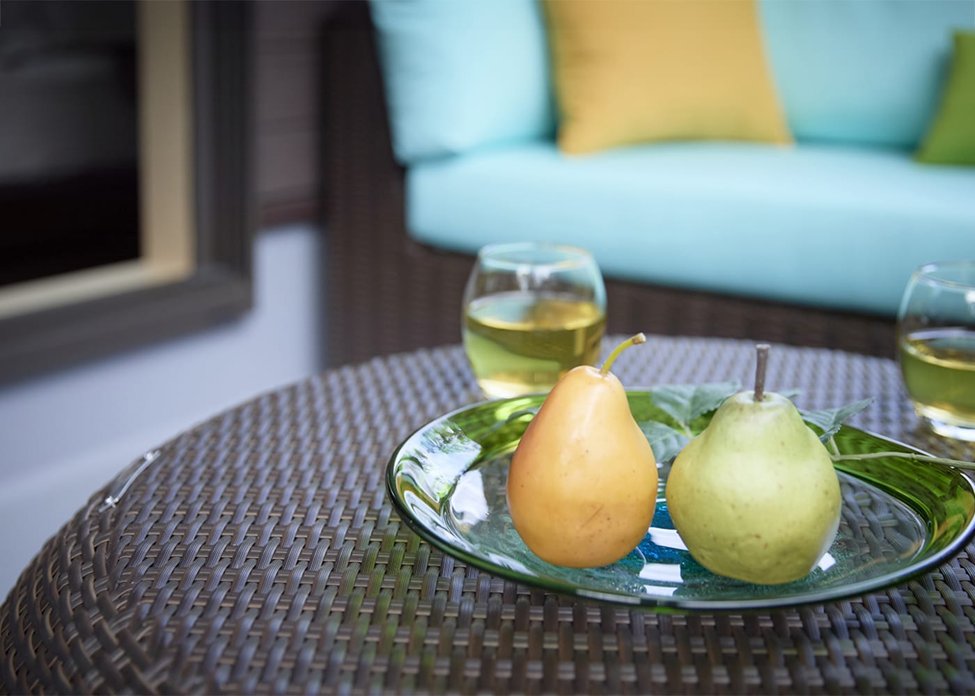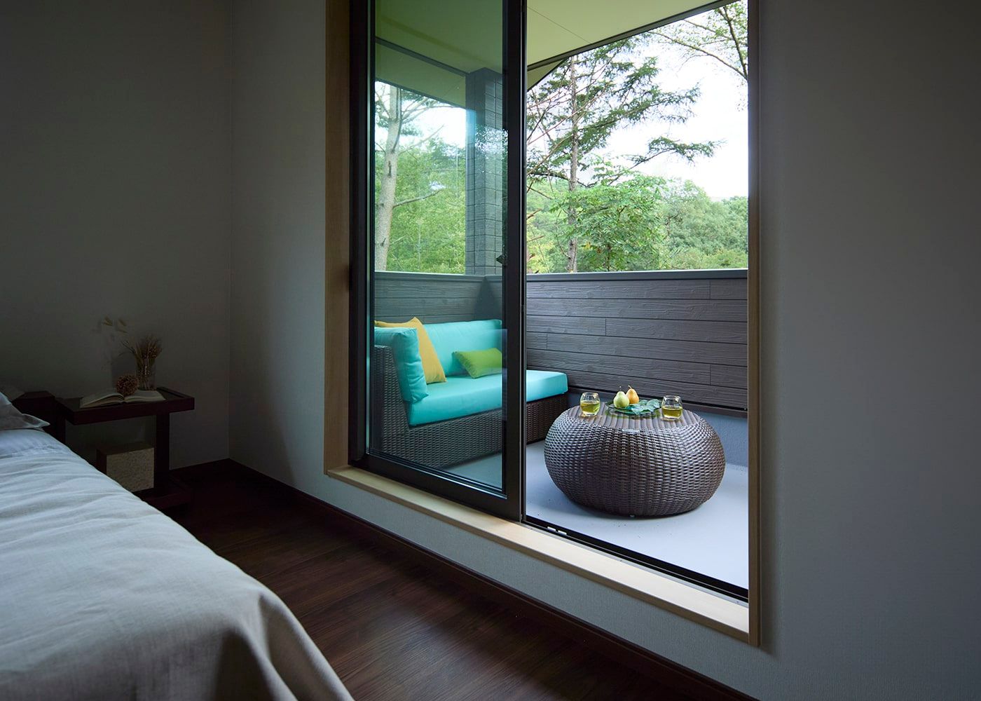 豊かな緑に溶け込むようなテラスを寝室のバルコニーに作りあげました。洗練された編み込みデザインの屋外家具で、室内と一体感を持たせたテラス空間です。こだわりの別荘がまるでオープンカフェのような寛ぎの場に様変わりしています。