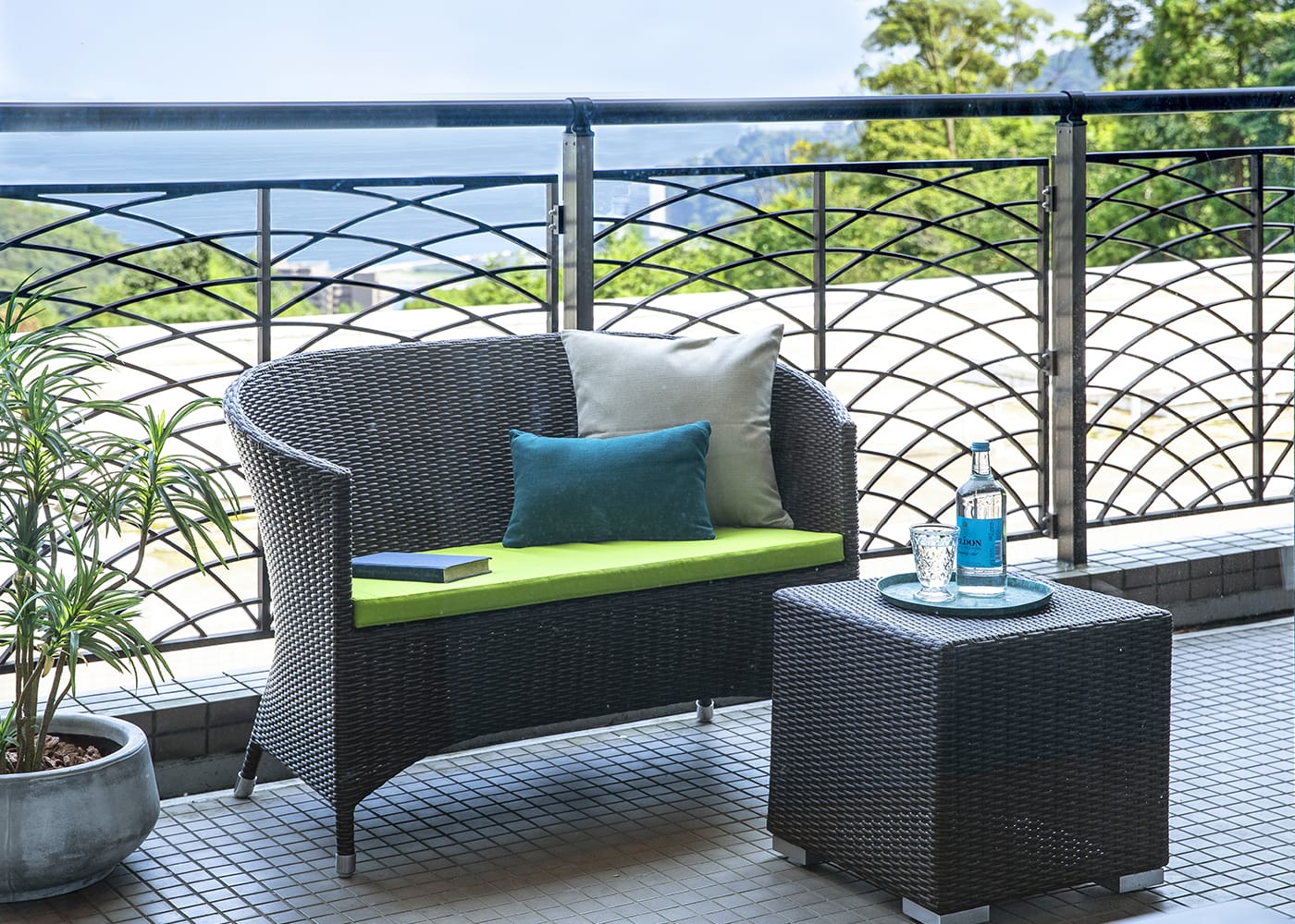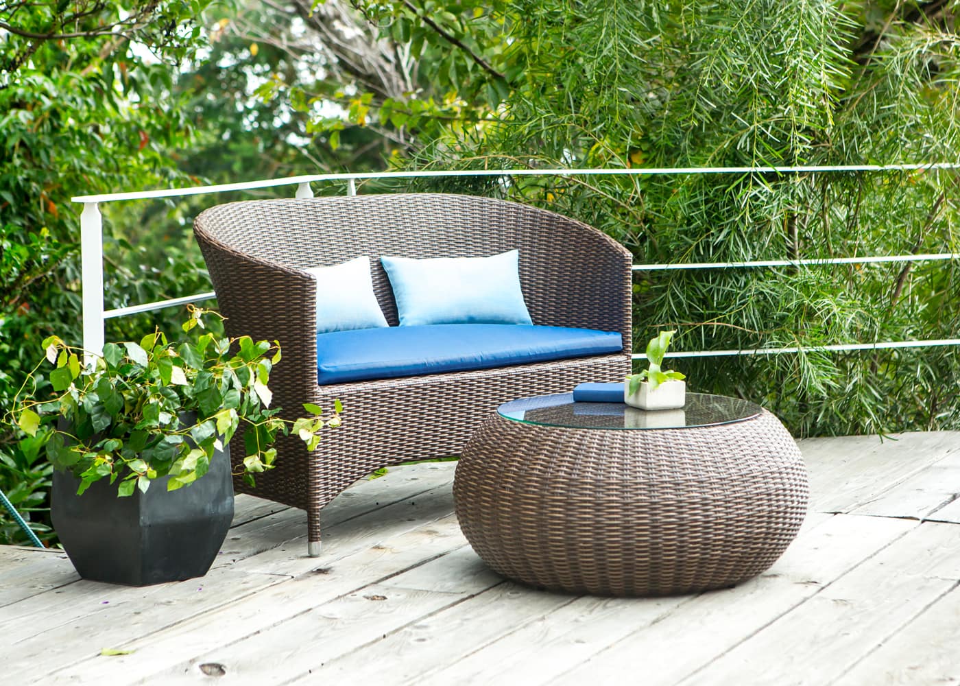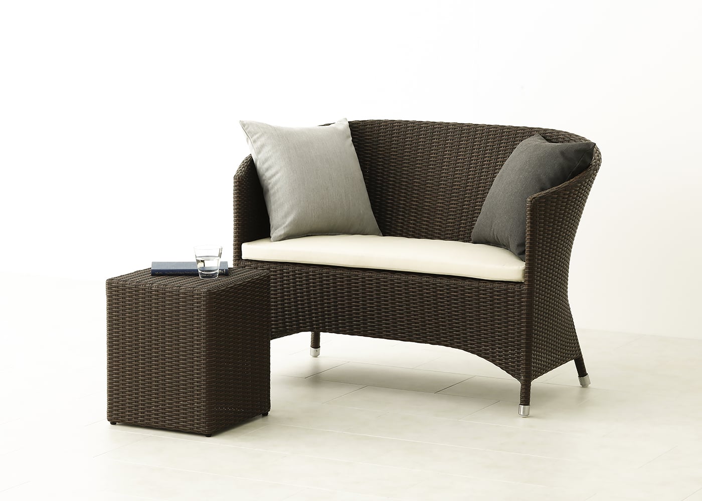 コーヒー・テーブルと合わせると横並びで会話を楽しむことができます。立体感のある形状が奥行きを生み出し、テラスやバルコニー、庭の雰囲気に自然に溶け込みます。(写真はTPブルー)
