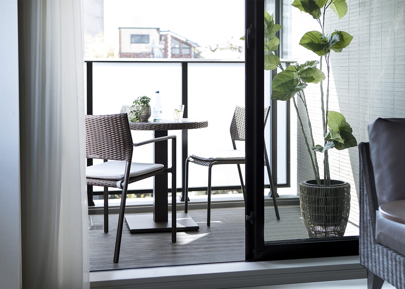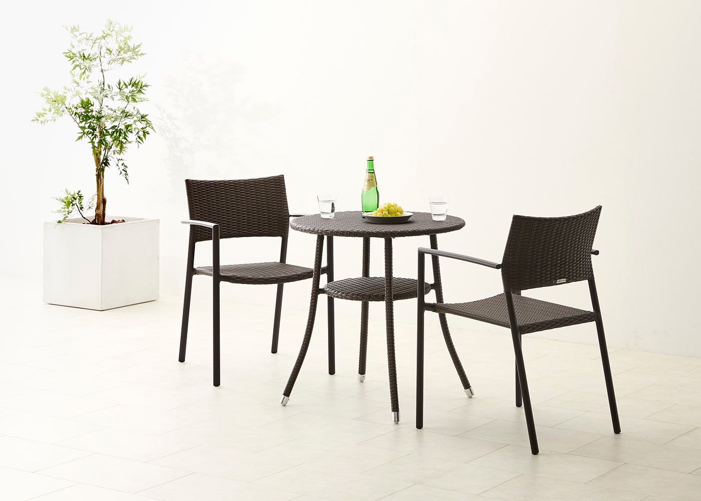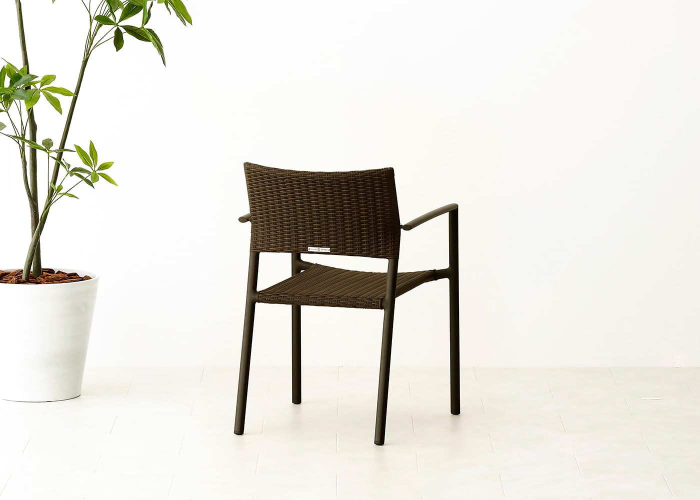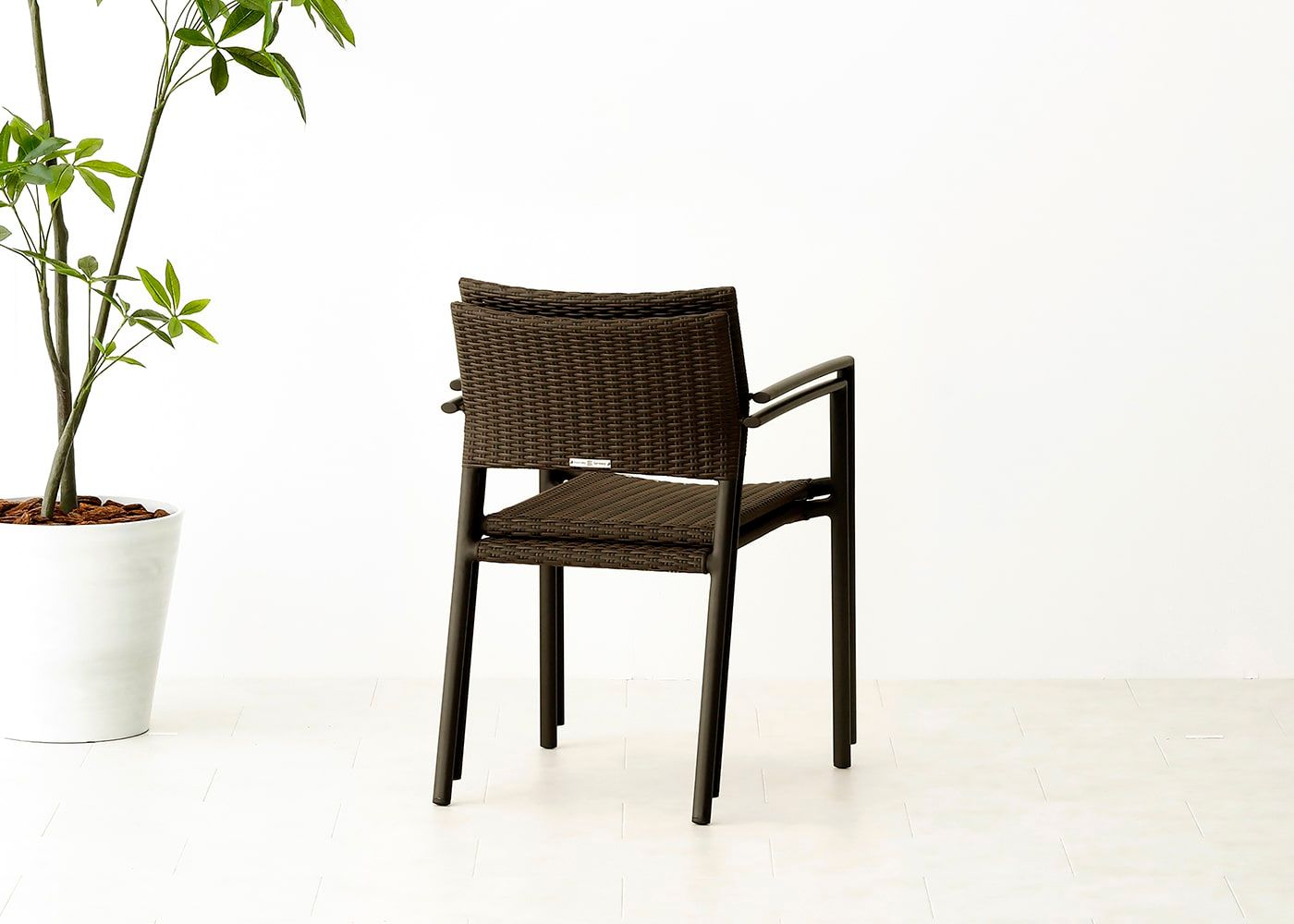 都会のコンパクトなバルコニーにもぴったりな、ガーデン・スタッキング・アームチェアv02。抜け感のある