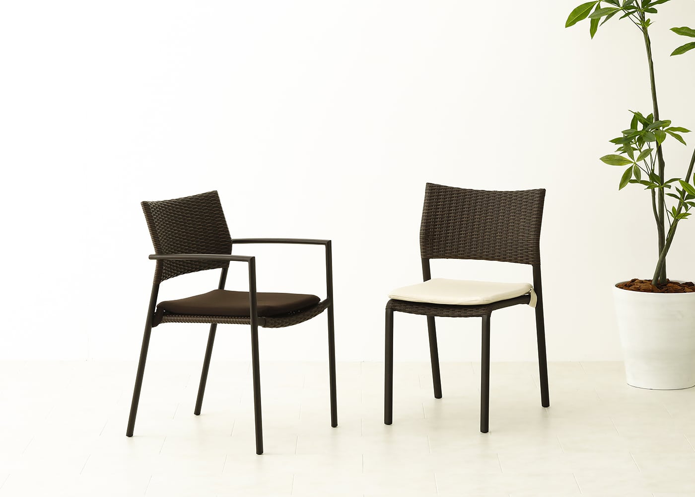 シャープなアームと洗練されたフォルムが魅力のガーデン・スタッキング・アームチェアv02。強い日差しや風雨による劣化を気にせず、屋外に一年中置いておける耐久性と美しさを兼ね備えた高品質の屋外用家具です。