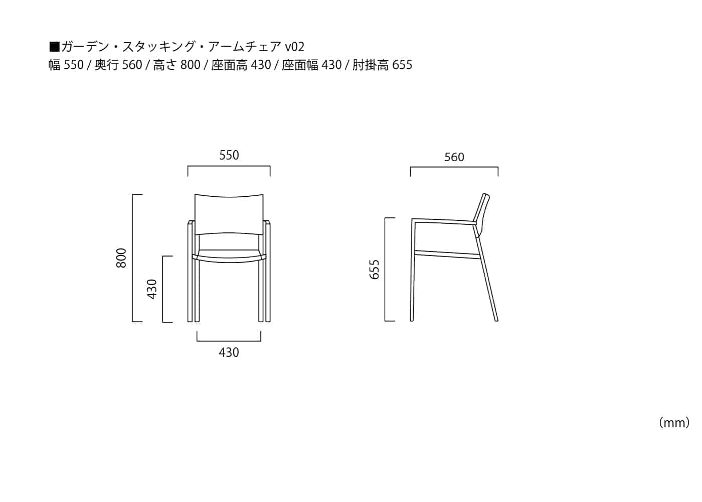 幅550 / 奥行560 / 高さ800 / 座面高430 / 肘掛高655