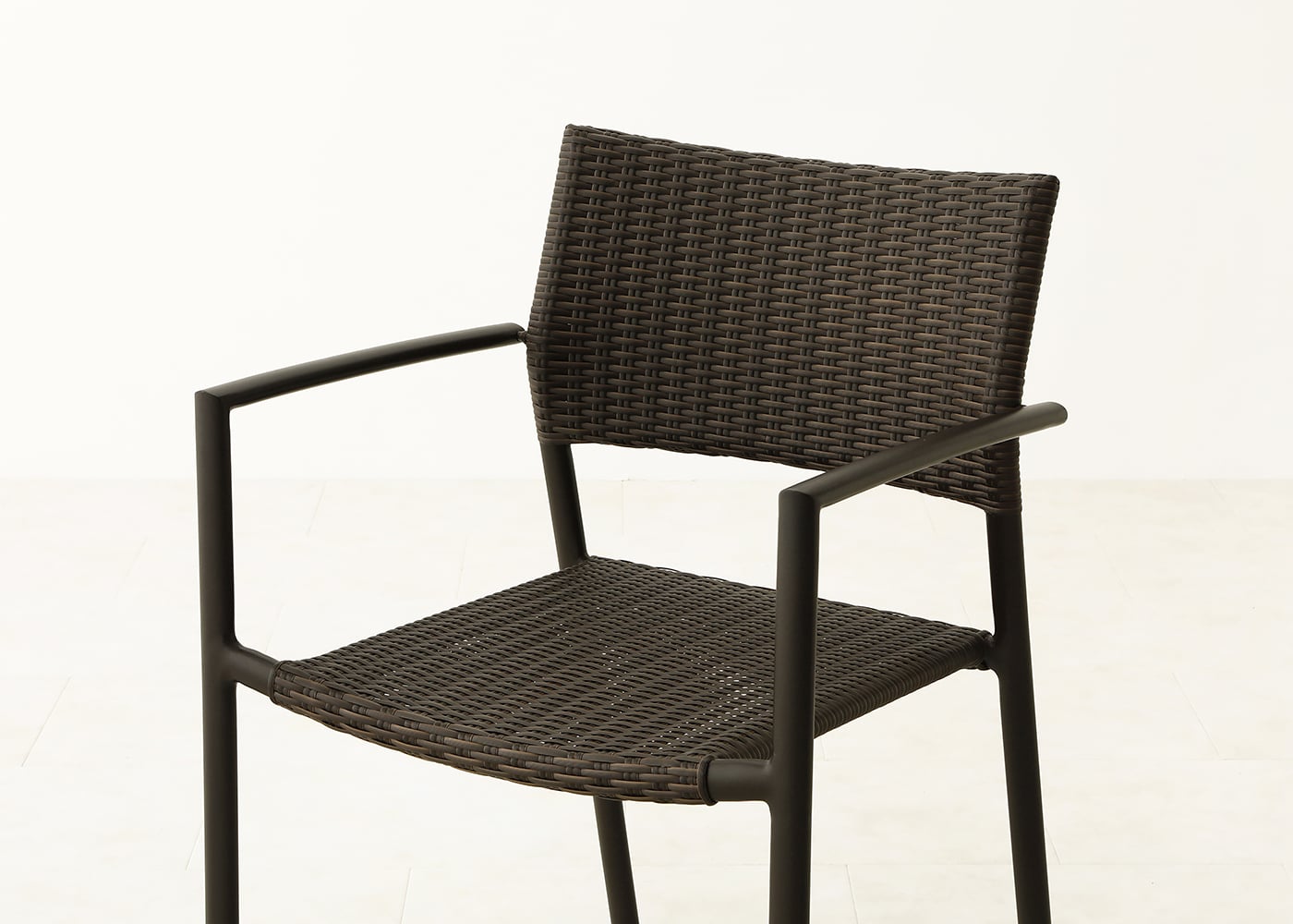 細くて直線的なフレームを生かしたモダンで軽快なフォルムが特長のガーデン・スタッキング・アームチェアv02。肘を置く場所があることで、姿勢が安定してゆったりと座れます。