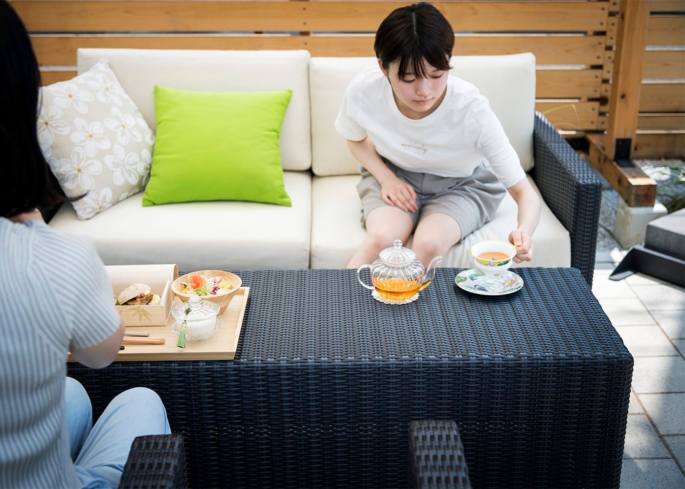 屋外空間でもプライベートタイムを満喫できる贅沢スペースを実現。快適な屋外用ソファとテーブル、絶品フードで素敵な時間をお過ごし頂けるカフェ実例です。