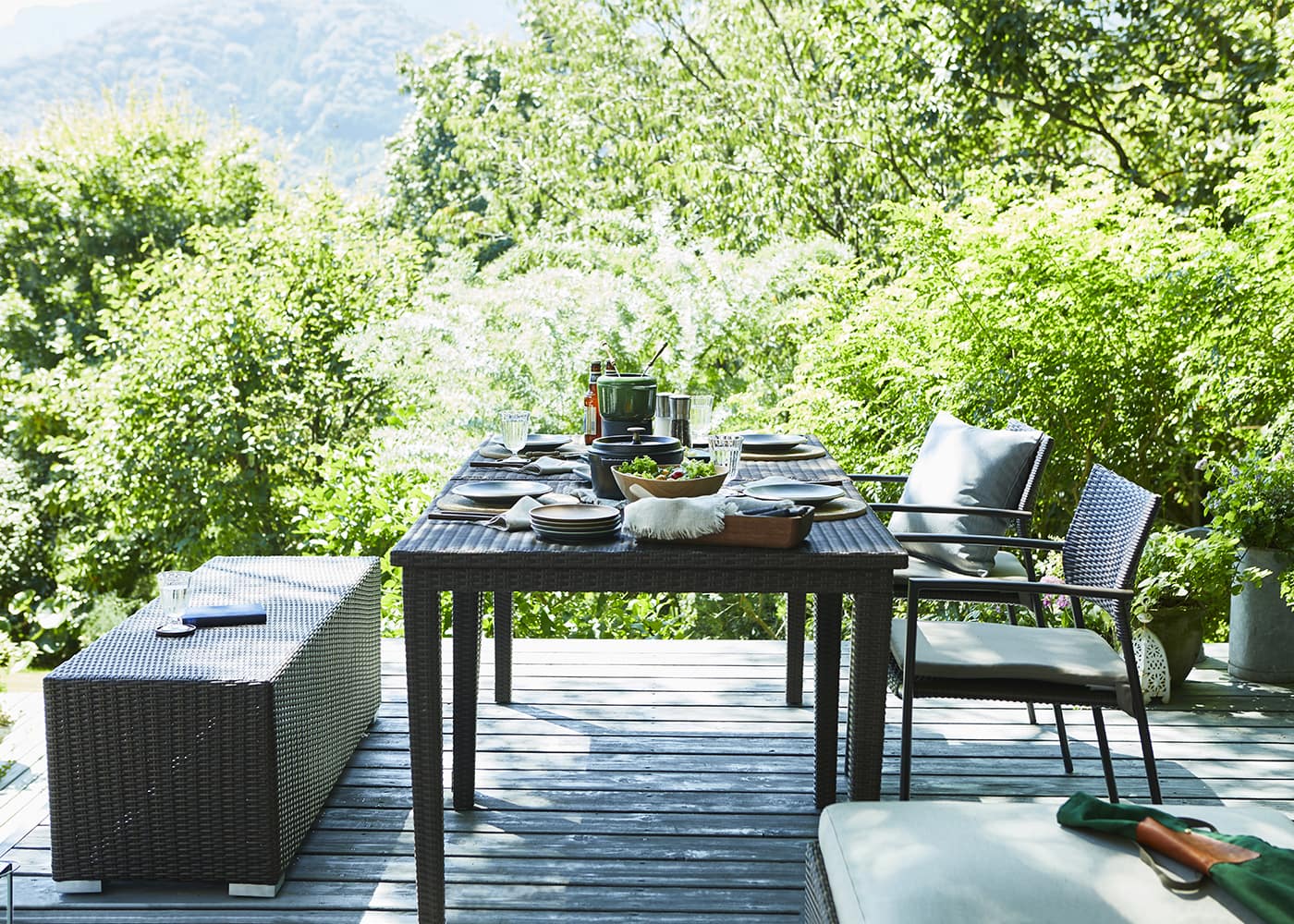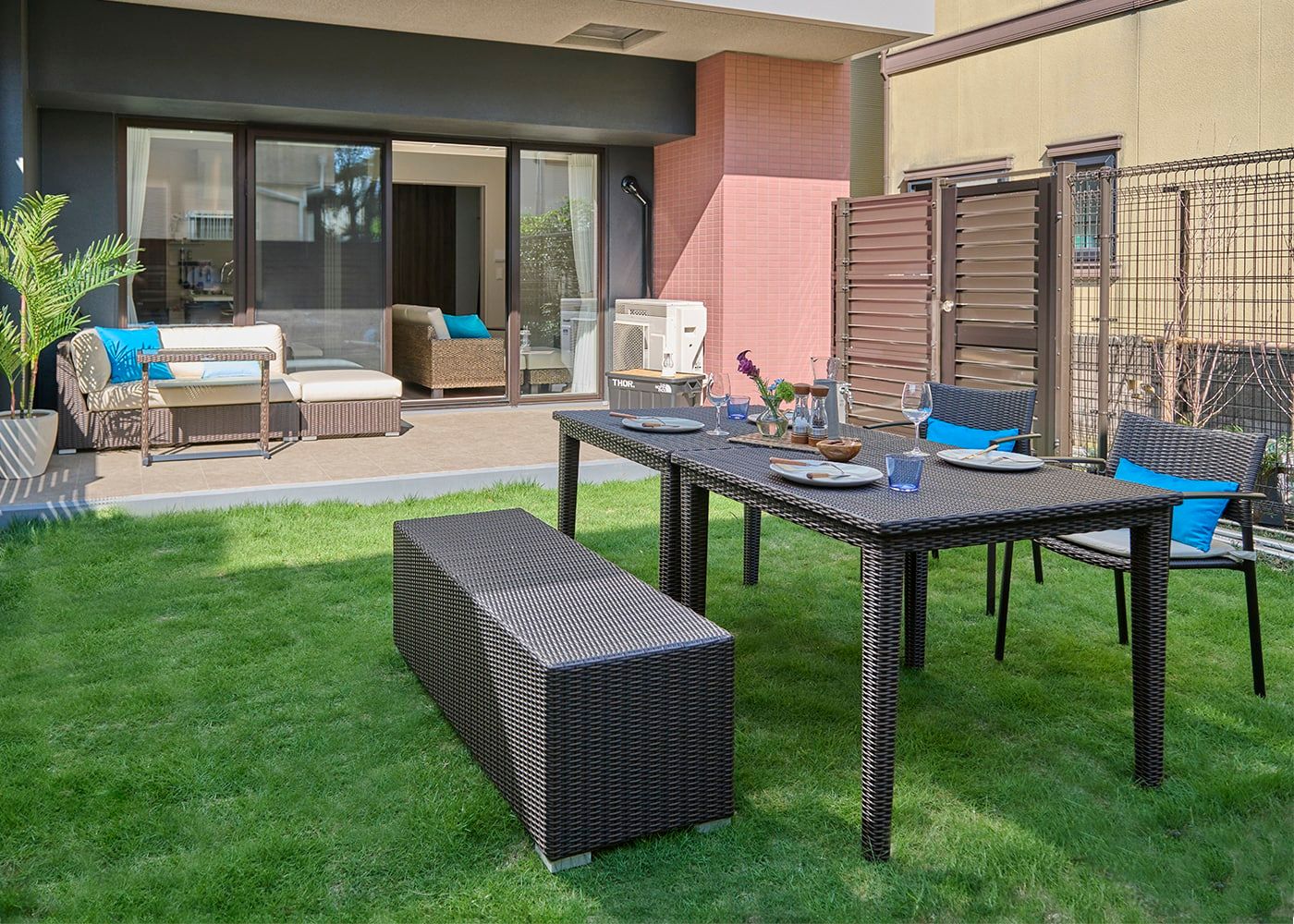 ご家族でアウトドア気分も味わえる「広い庭付きの住まい」のコーディネート例。テラスにはダイニングセットを中心にレイアウトし、自宅でも公園で過ごせるような時間を手に入れました。