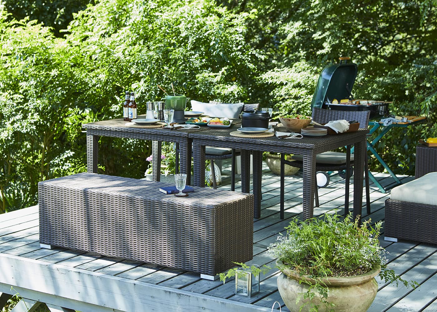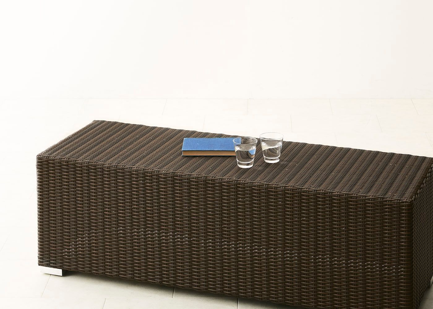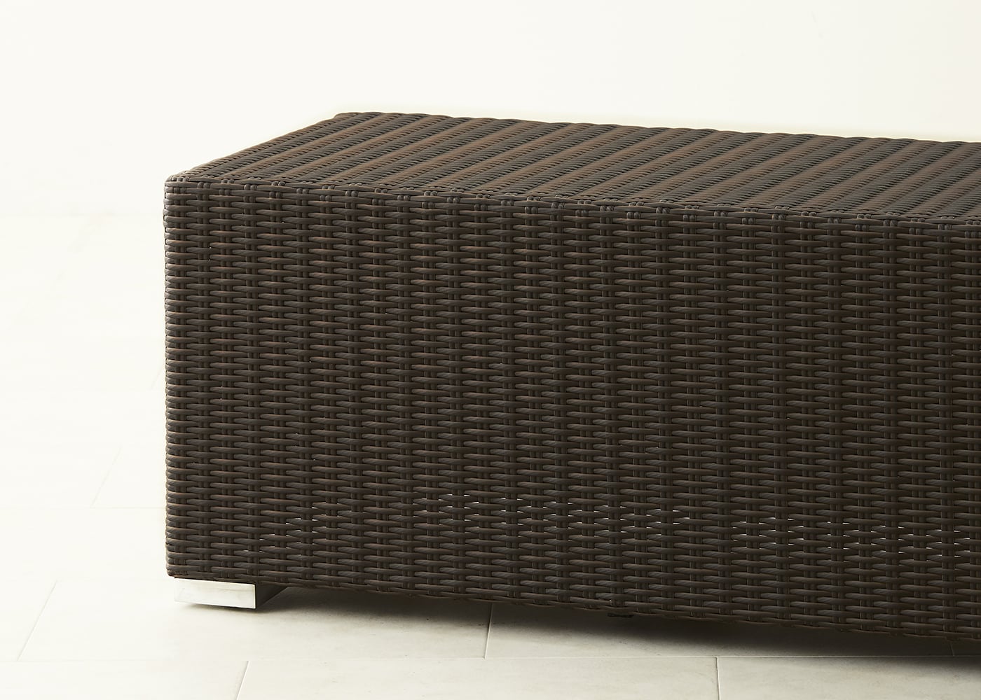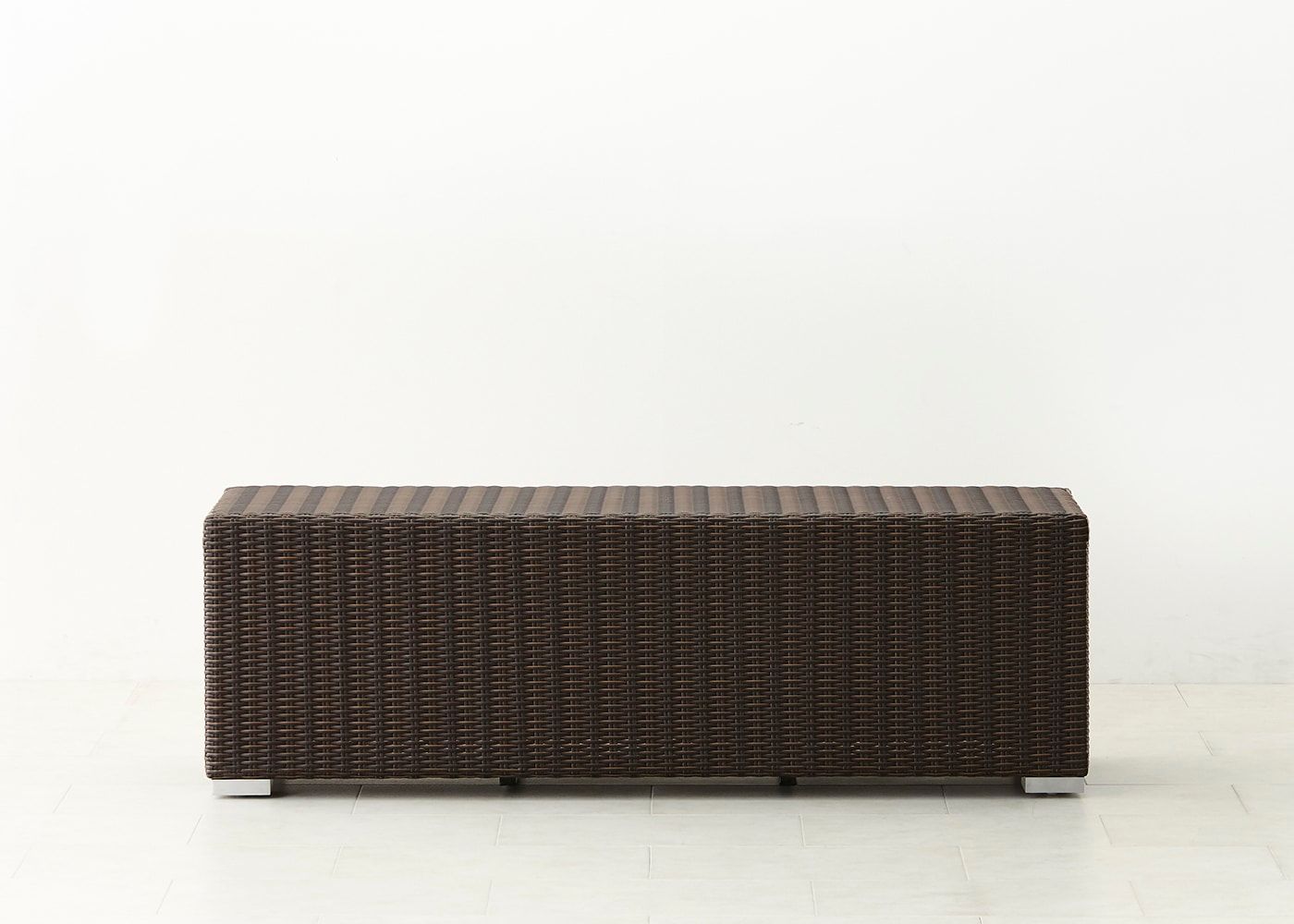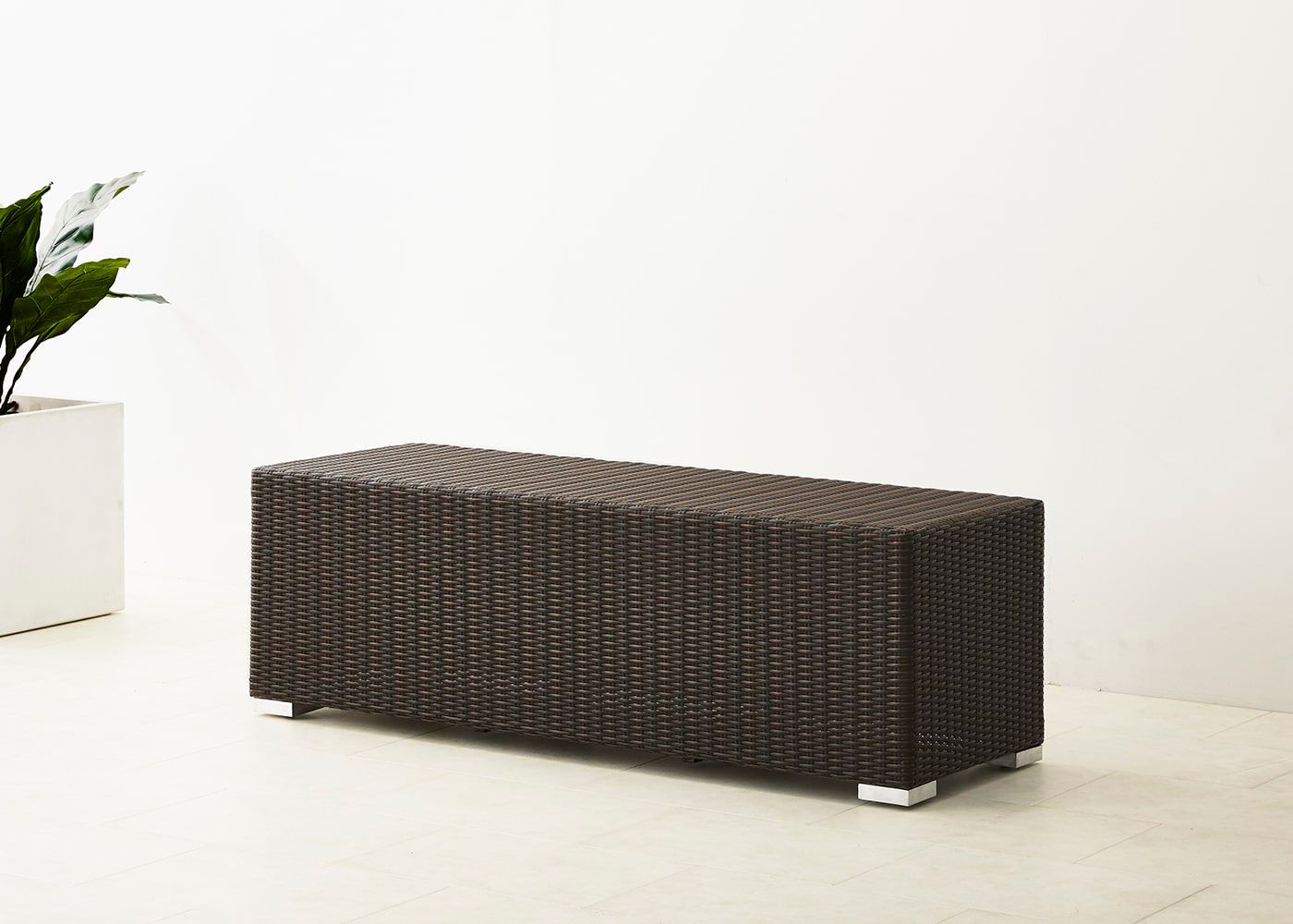 シンプルでスクエアなデザインが魅力のベンチ&テーブル。耐久性に優れた高密度ポリエチレン素材が職人によって丁寧に編み込まれています。手編みならではの高級感と温もりのある自然な風合いに仕上げました。