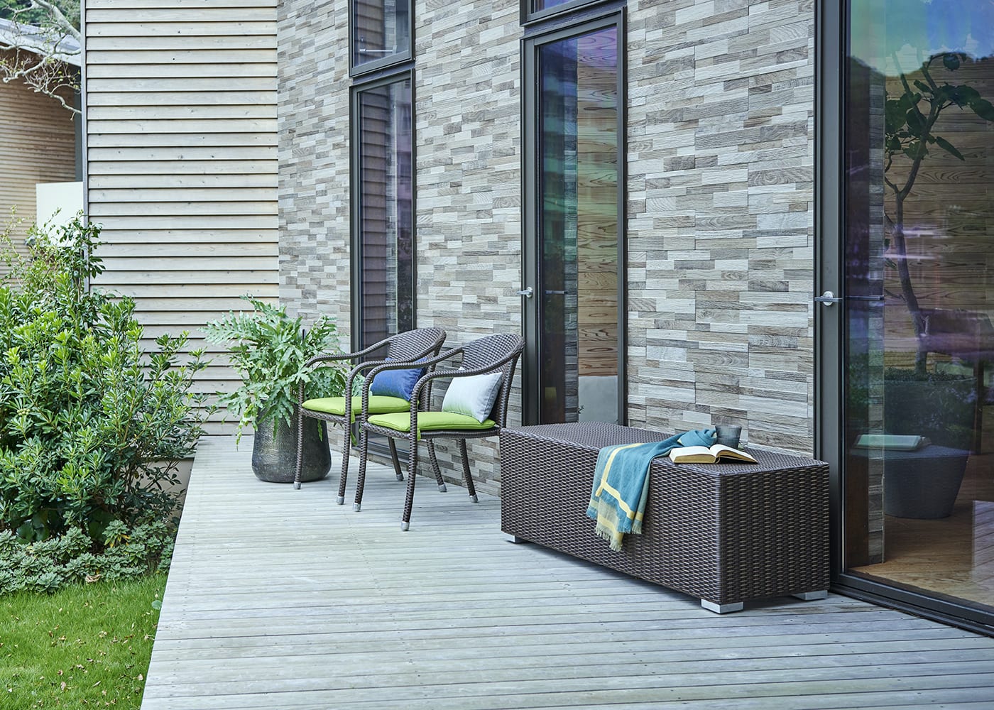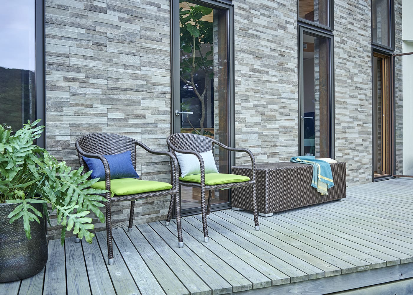 おしゃれな別荘のオープンテラスに、ガーデン・ベンチ&テーブルを配置したコーディネート例。ウッドデッキに腰かけてくつろぐだけで、朝の澄み切った空気感を味わえるでしょう。