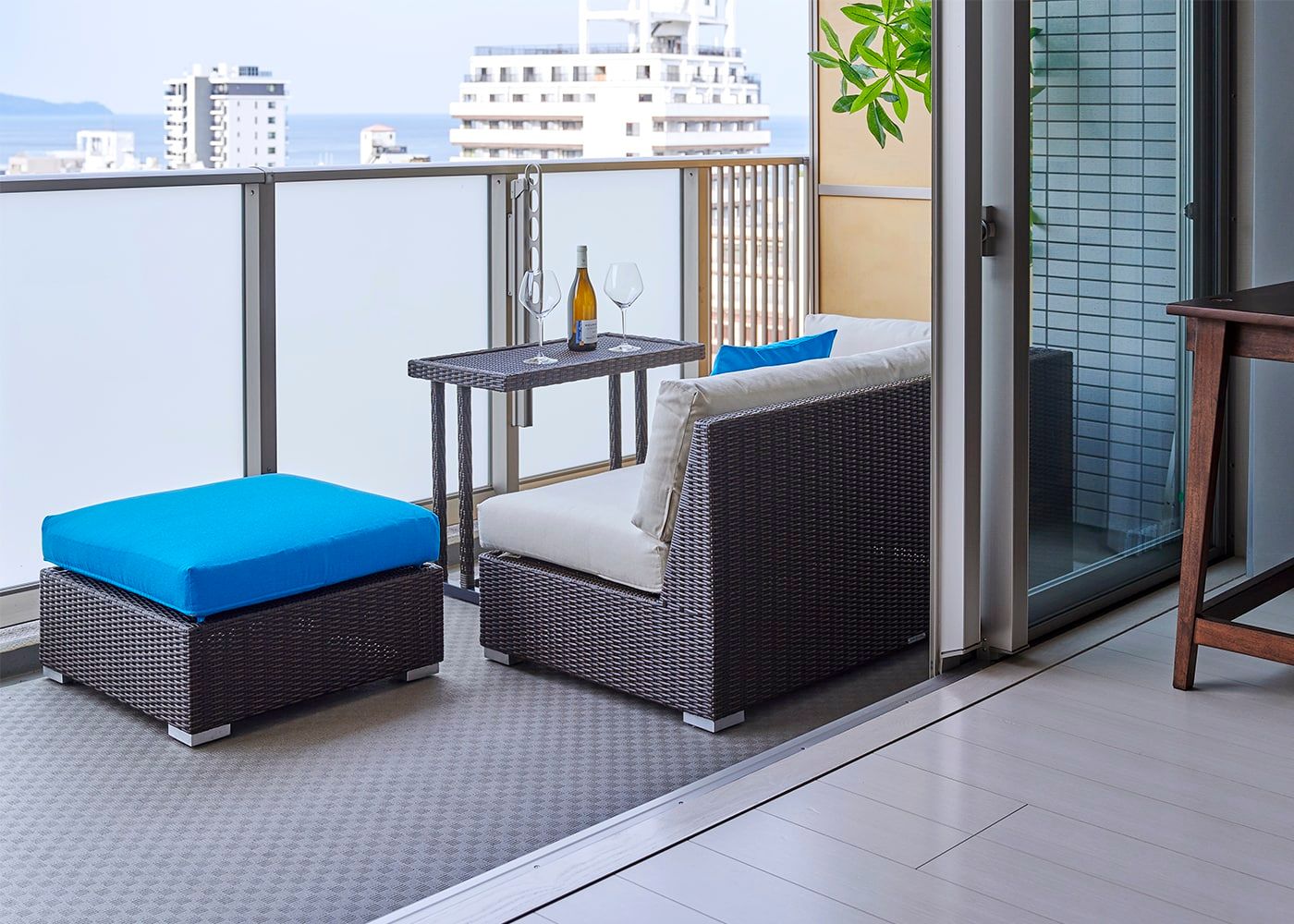 気持ちが良い熱海の風を感じるバルコニーにブルーの屋外用家具をレイアウトすることで、特別なひと時を過ごせる別荘インテリアに。バルコニーにもレイアウトしやすい片肘の屋外用ソファで、熱海の絶景を満喫。メンテナンス性や対候性にも優れているため、普段生活しない別荘に最適です。
