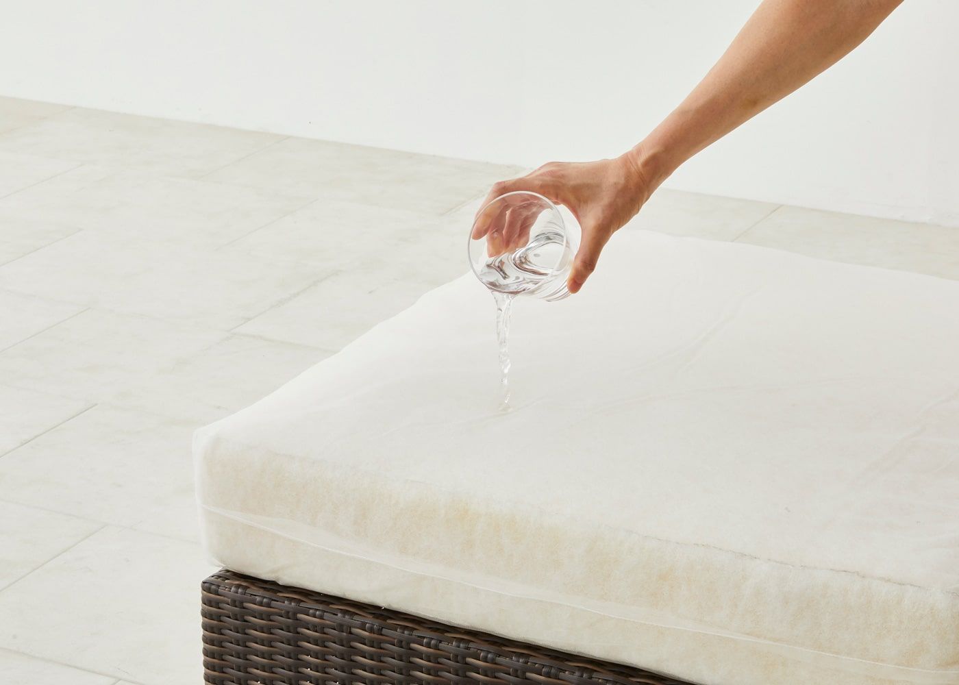 カバー生地のテンポテストは、アクリルを原料から染めるという特殊な製法のため色褪せしにくく、防カビ・防腐・防汚・エクストリーム撥水加工を施した、一年中屋外で使用可能なイタリア製の高機能ファブリックです。万が一、汚れても手洗い可能でいつも清潔に保てます。高機能でありながらコットンのような優しい肌触りや風合いを兼ね備えています。
