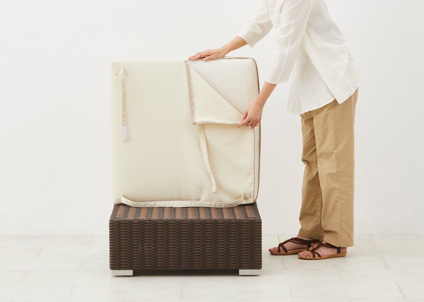 クッションのカバーは、14色の豊富なバリエーションからお好みのカラーをお選びください。写真はオットマン(TPアイボリー)