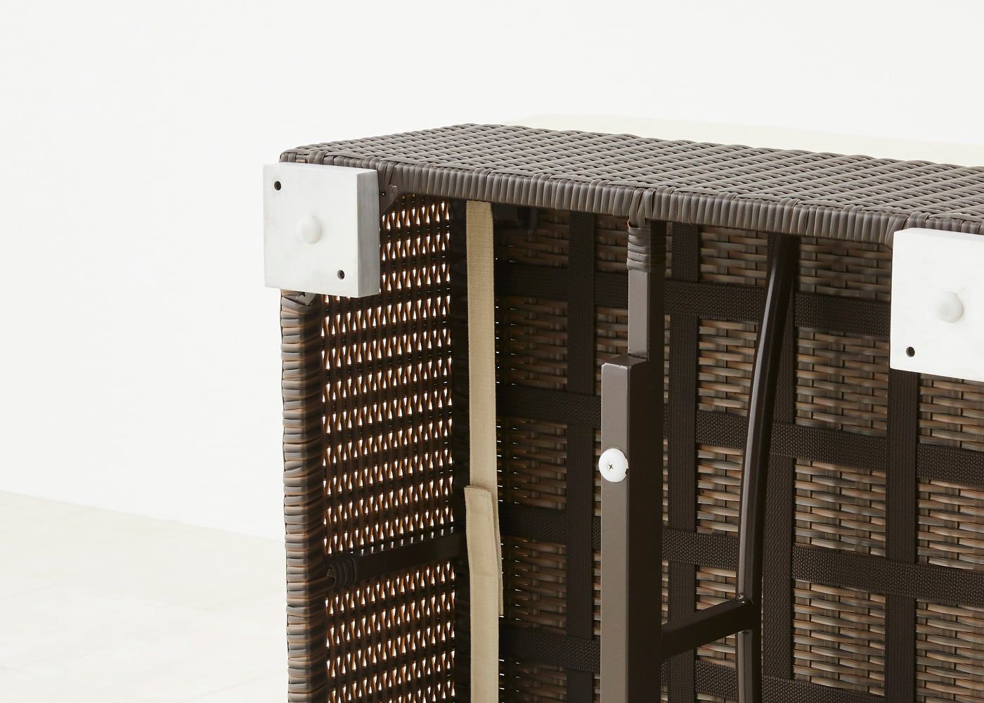 ソファの骨組みに特殊コーティングを施したアルミフレームを採用したことで、耐久性の向上と軽量化を実現しました。脚にはアルミと樹脂製のキャップを取り付け、屋外の硬く荒い地面でもご使用頂けます。