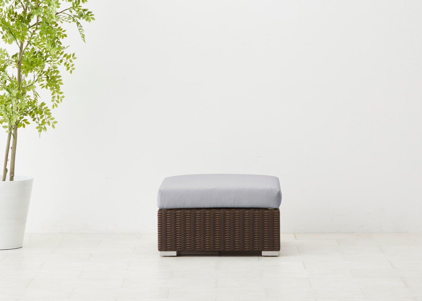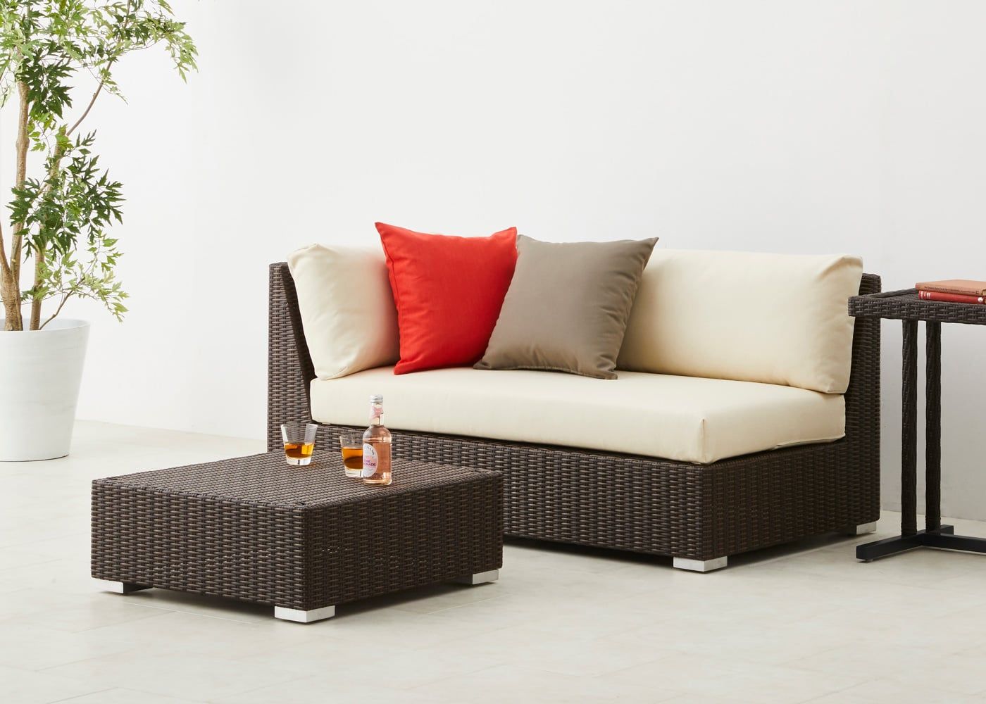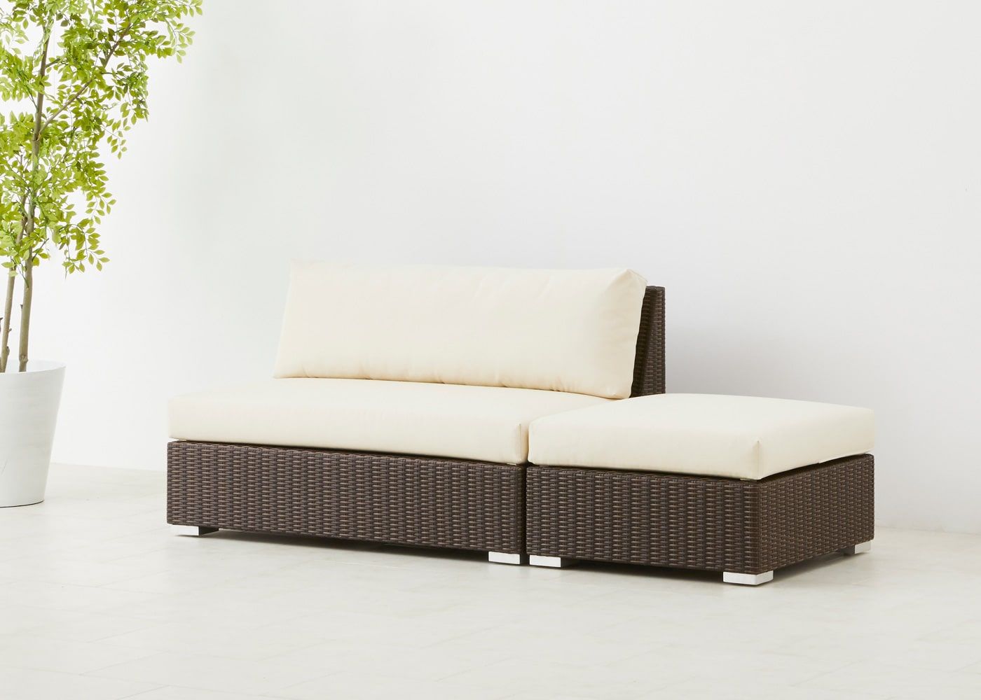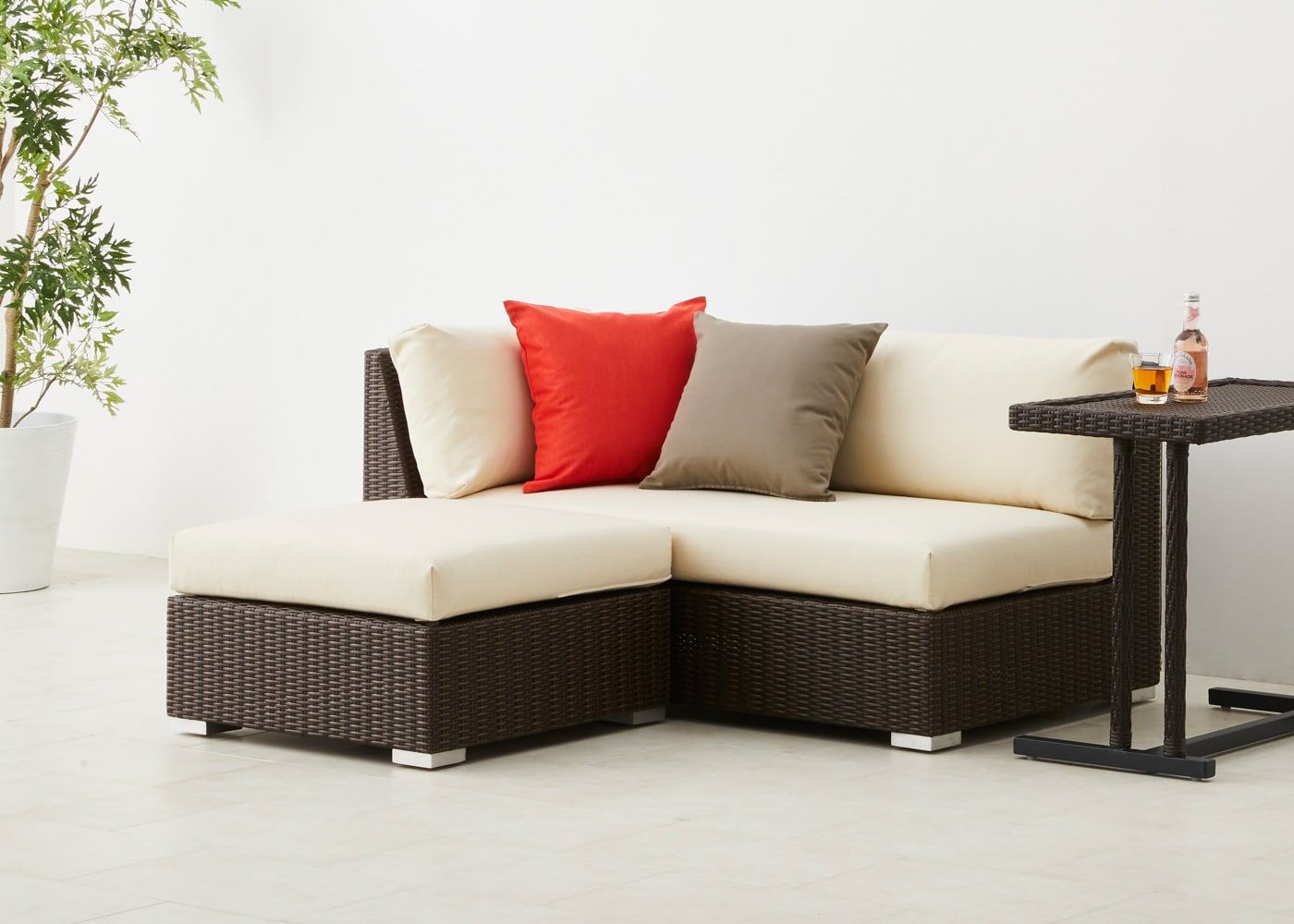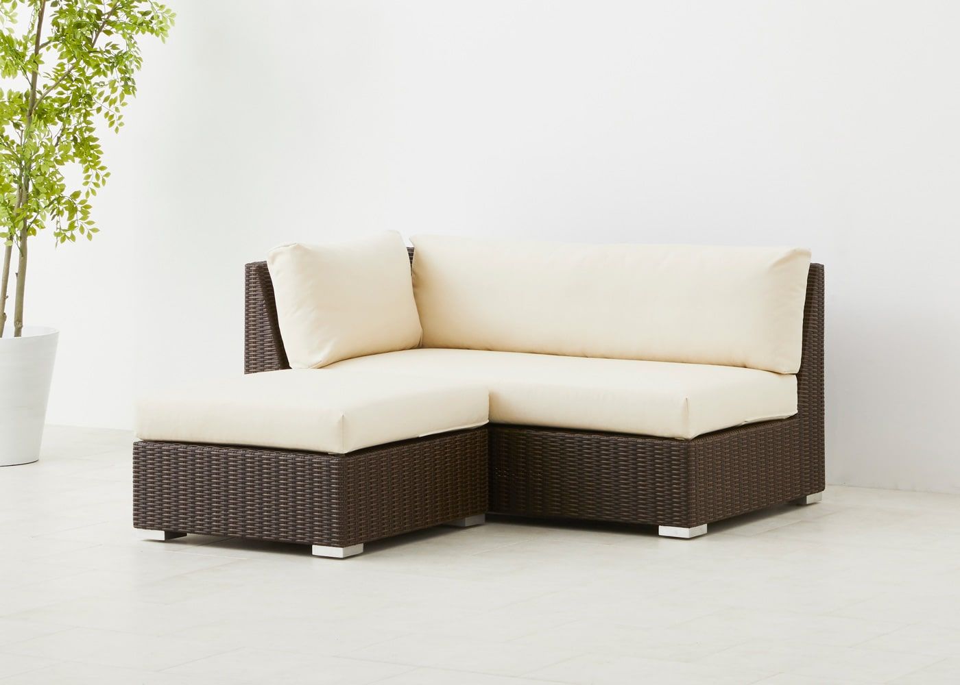 オットマンを片アームの横に設置すれば、カウチソファのような使い方も可能です。バルコニーのサイズ感や屋外での過ごし方に応じて、他のサイズを組み合わせてみましょう。(写真は