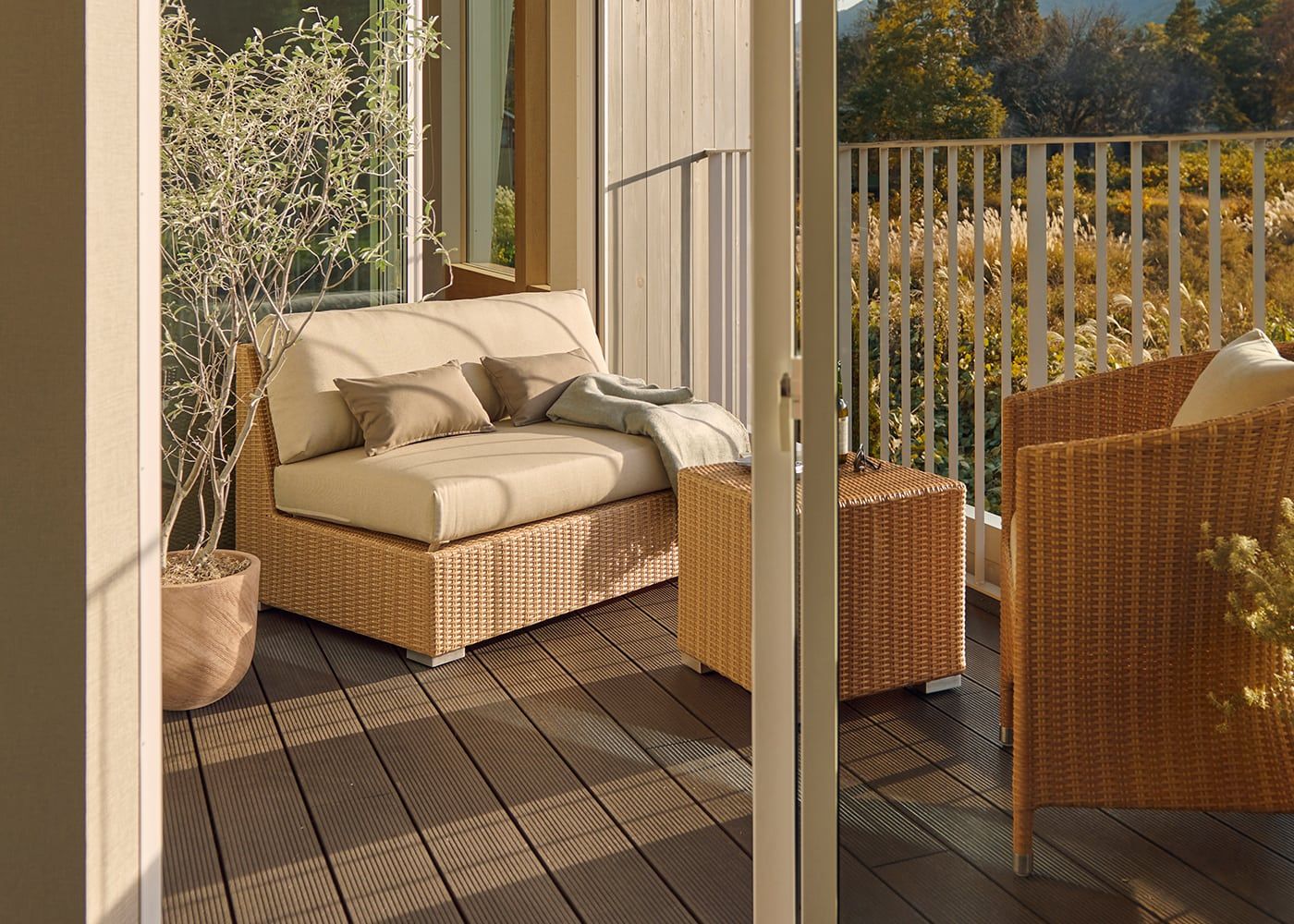 強い日差しや風雨に強い高密度ポリエチレン素材を採用。耐熱温度は-70~130℃で、リサイクル可能かつ安全性に優れています。自然な色ムラで天然素材に近い質感を実現し、変わらない風合いを保ちます。