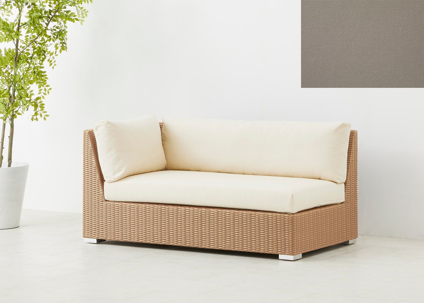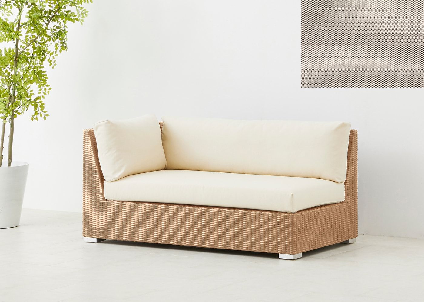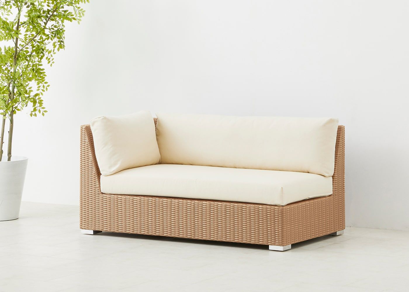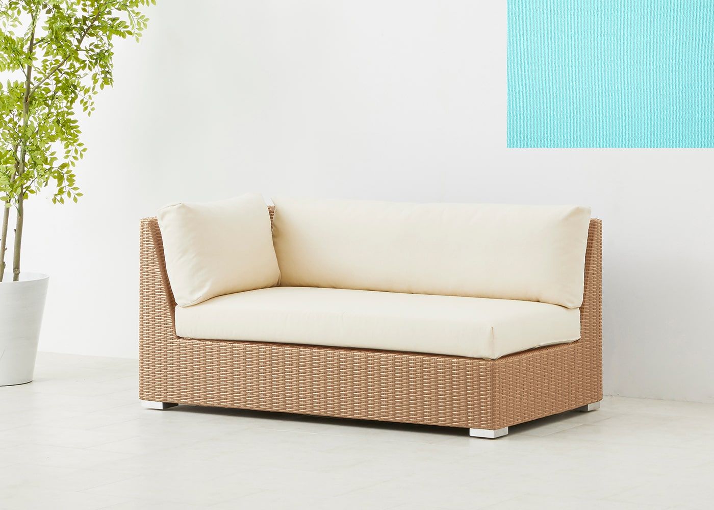 奥行きの浅いコンパクトなサイズが魅力のガーデン・コンパクトソファ 2P片アーム (NA)。日差しや風雨による劣化を気にせず、一年中屋外に置いておける高品質の屋外用家具です。(写真は2P左アーム+