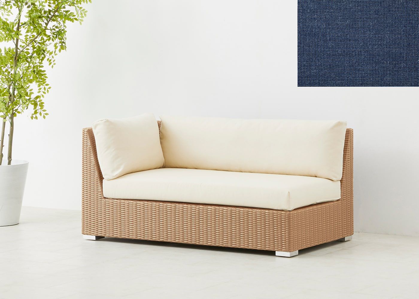 幅1400mm×奥行き750mmの省スペース設計で、アシンメトリーのデザインが魅力の片アーム。限られた空間にも置きやすく、片側に抜け感があることで圧迫感を抑え、屋外でもすっきりとした印象になります。(写真は2P右アーム)