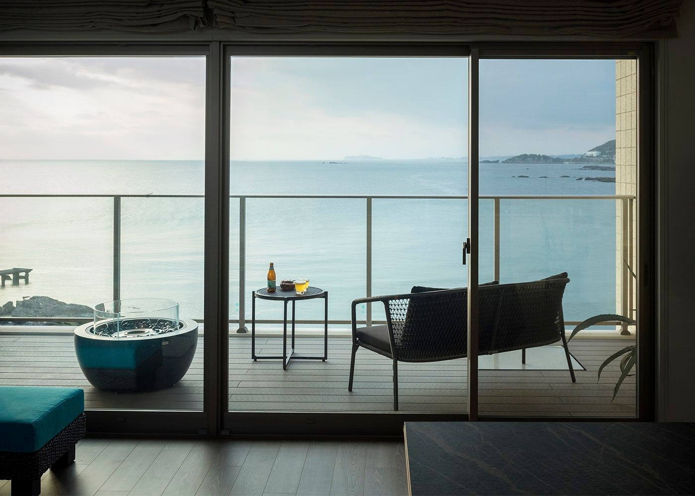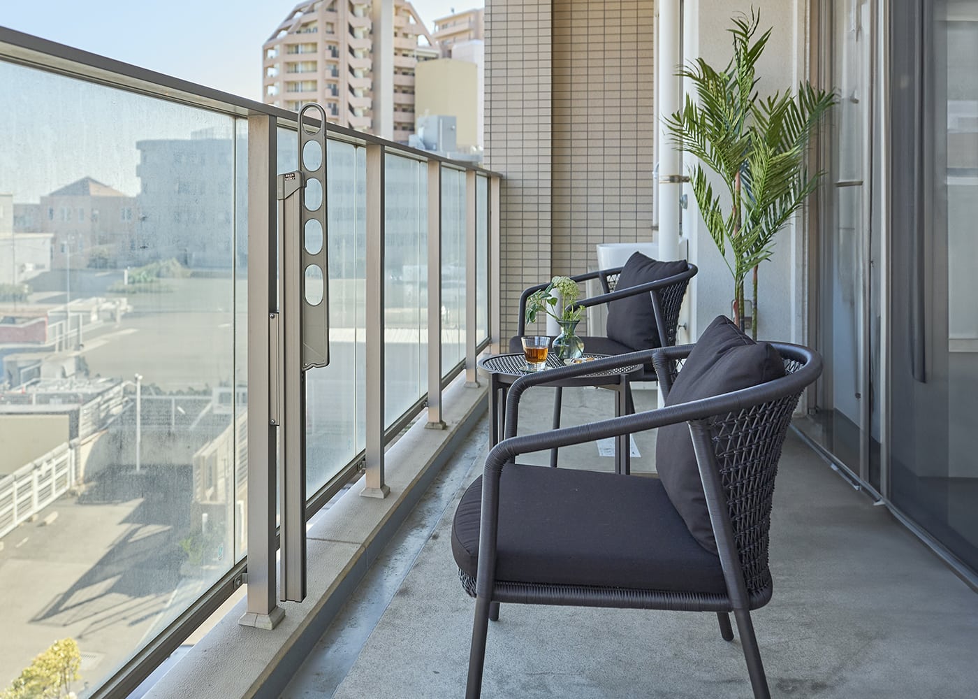 爽快なオーシャンビューを堪能できるインナーバルコニーには、大人の雰囲気を醸し出すダークブラウンフレームのガーデンソファがぴったりです。シックなグレーのクッションが、洗練された空間をさらに引き立て、リラックスタイムを格別なものに変えてくれます。