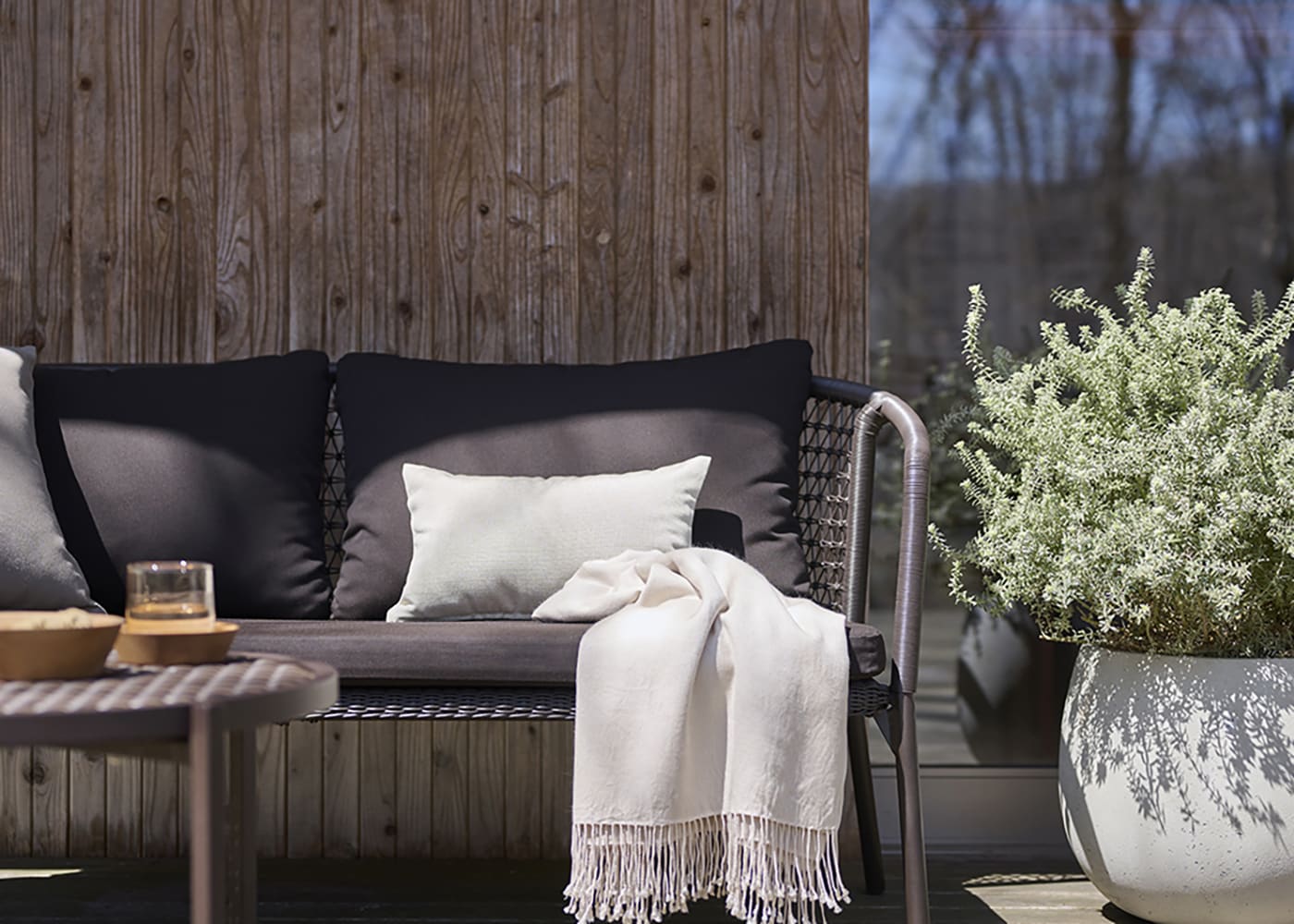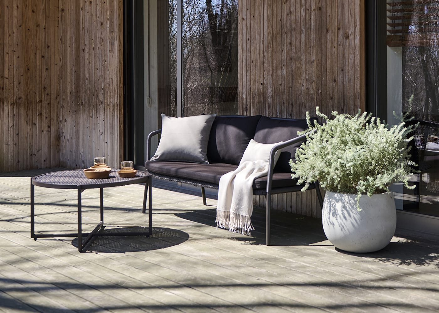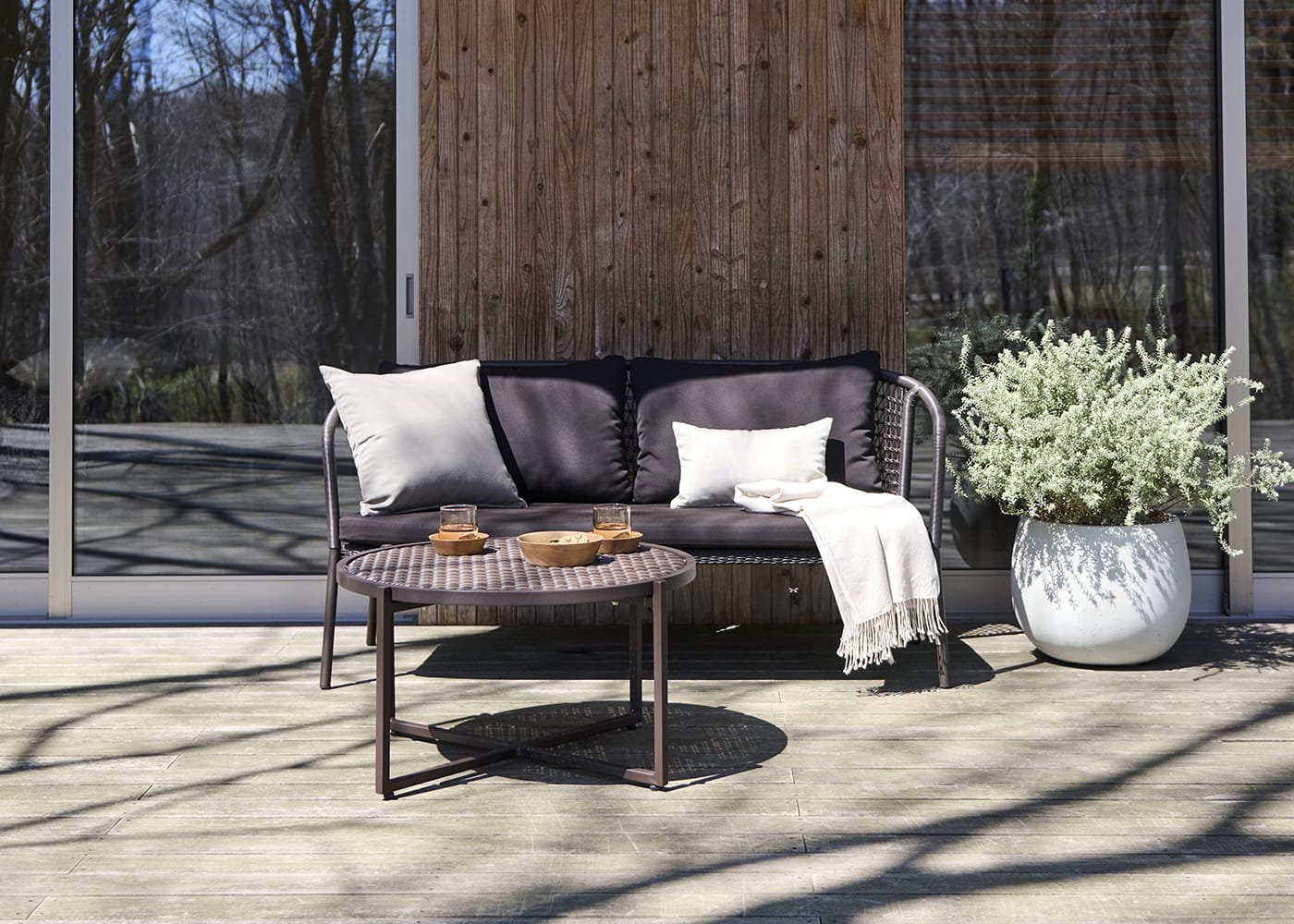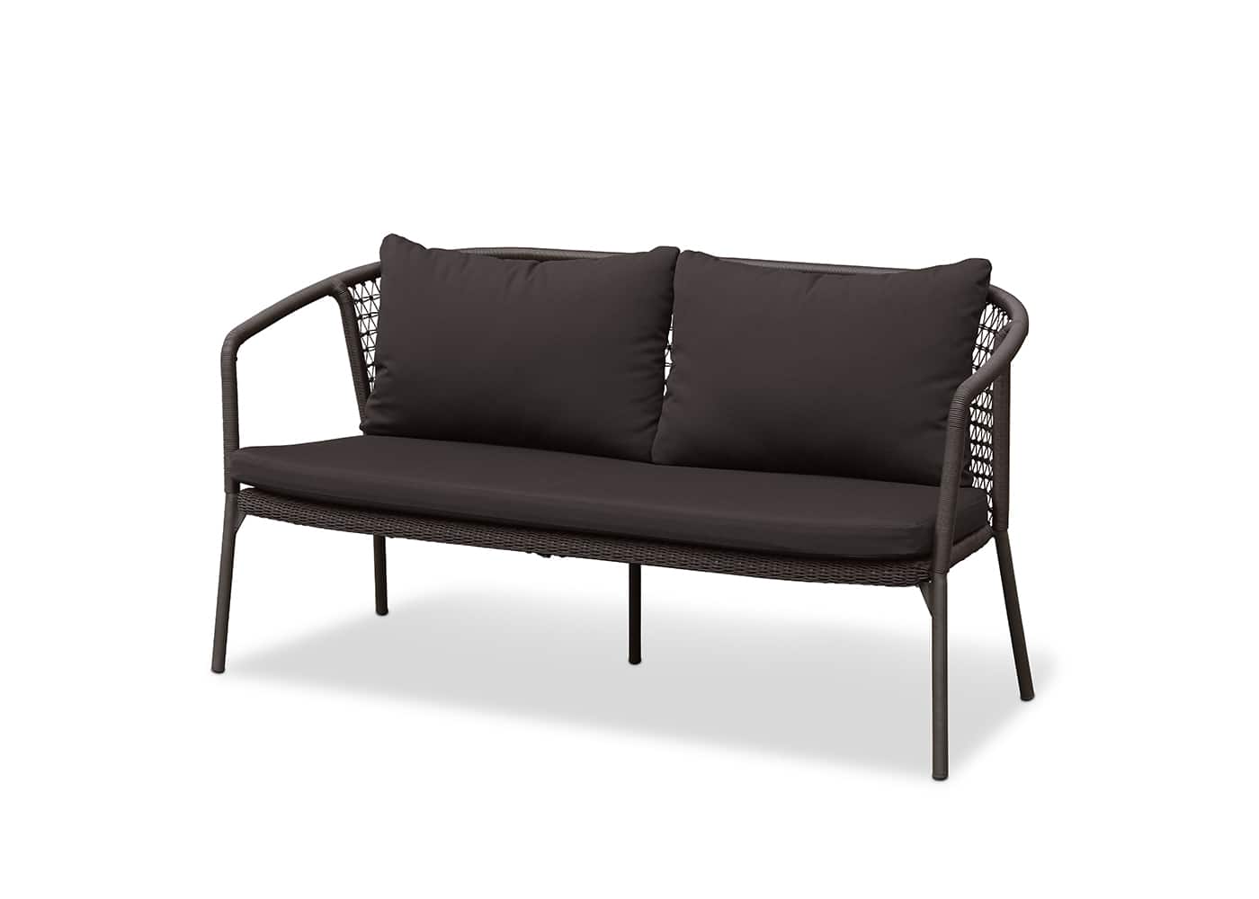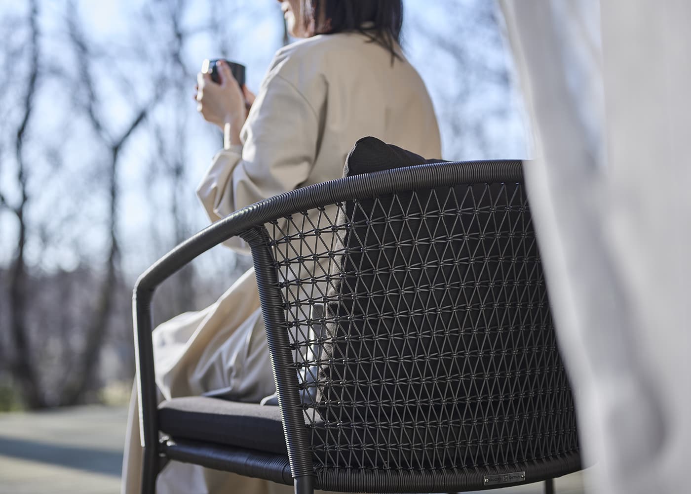 アームから脚にかけて曲線と直線を組み合わせ、どの角度から見ても存在感とまとまりがあるコンパクトな屋外用ソファです。通気性や機能性も兼ね備えていて、一年を通して快適に座ることができます。