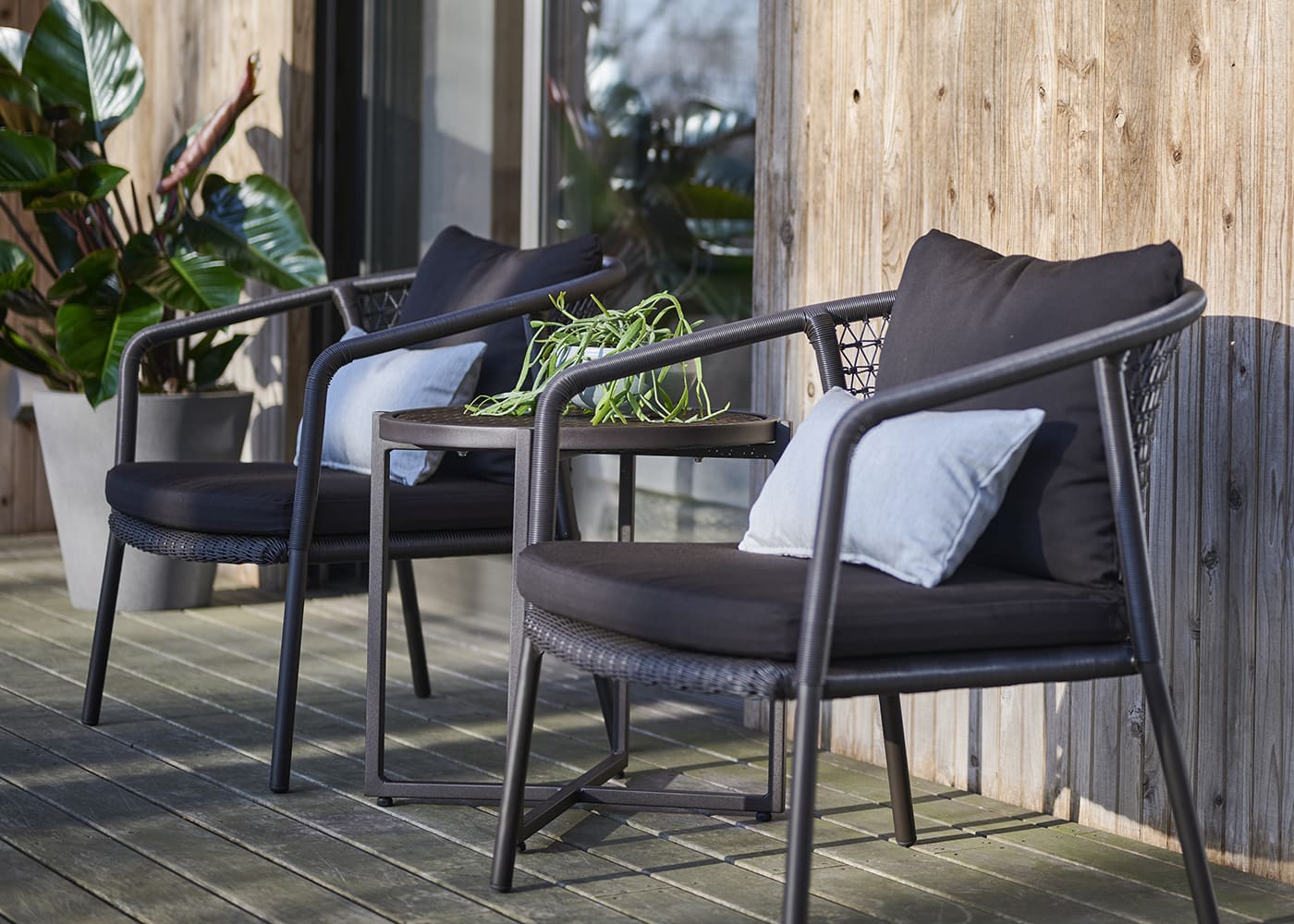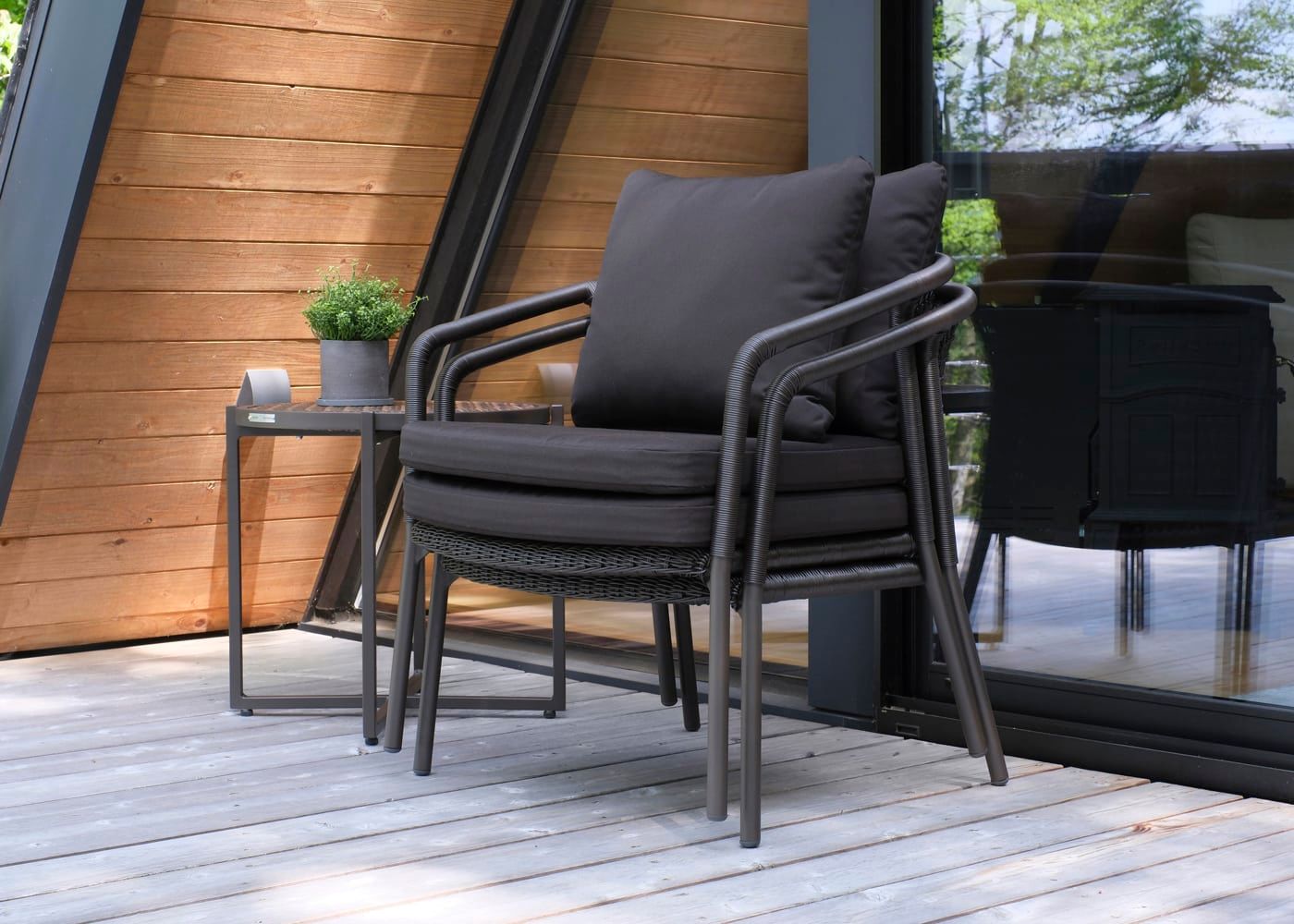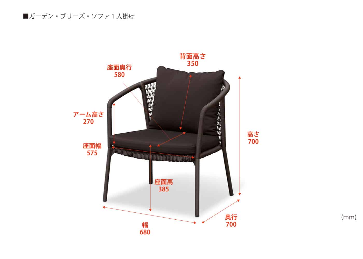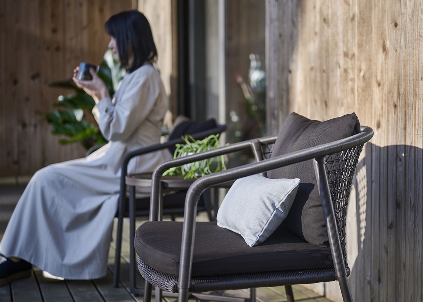 開放感をより際立たせてくれる1人掛けのガーデン・ブリーズ・ソファ。コンパクトでスタイリッシュなフレームは持ち運びや移動にも適しています。カフェテラスを連想させるようなコーヒーテーブルとの組み合わせで、非日常感を演出しました。