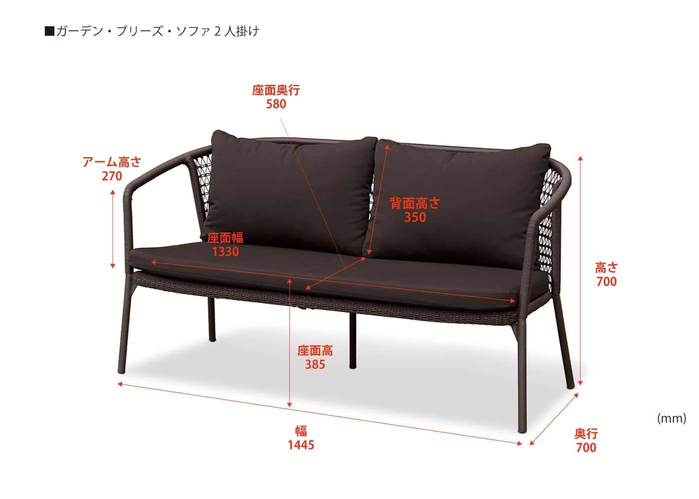 細く丁寧に編まれた素材とスタイリッシュなデザインが特長のガーデン・ブリーズ・ソファ。二つのサイズからお選び頂き、ソファカバーはお気に入りの色で自由にコーディネートできます。強い日差しや風雨による劣化を気にせず使える、耐久性と美しさを兼ね備えた高品質の屋外用家具です。(写真は2人掛け)