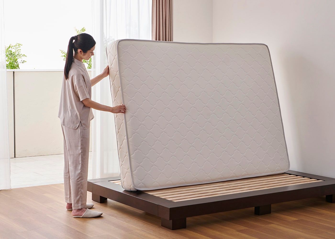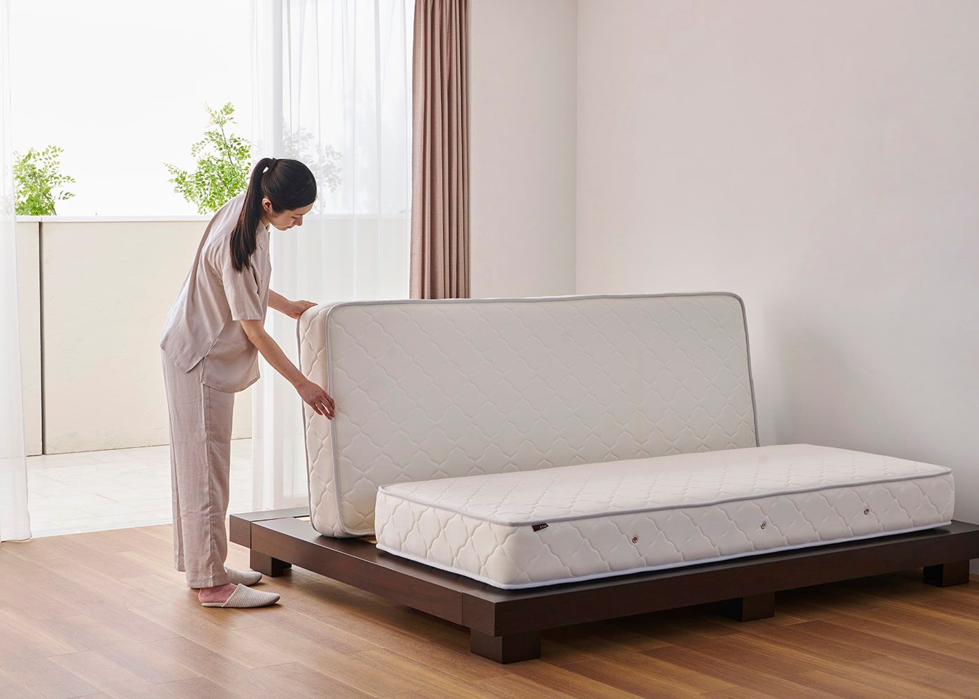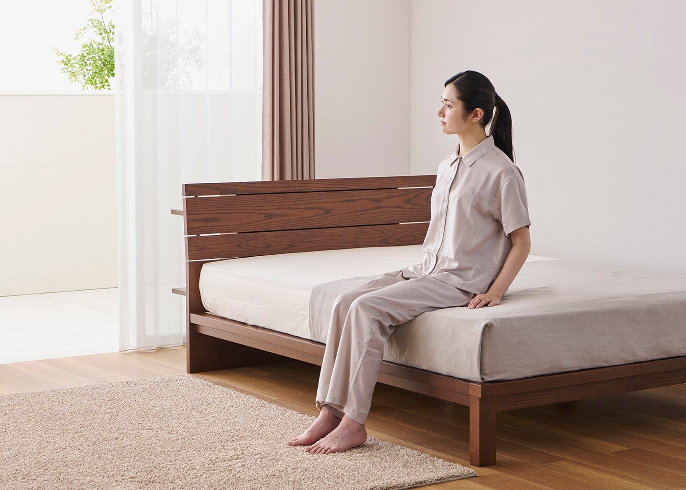 ムク・ベッドにダブル(ハード)を置いたイメージ。マットレス上面高さ=480mm。モデルは身長167cmの女性)