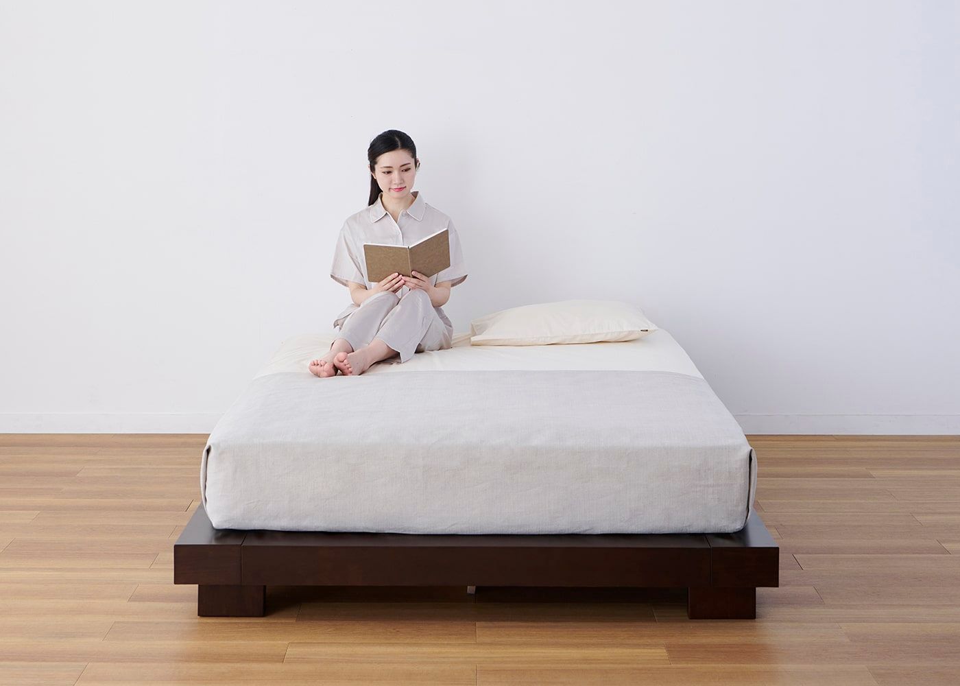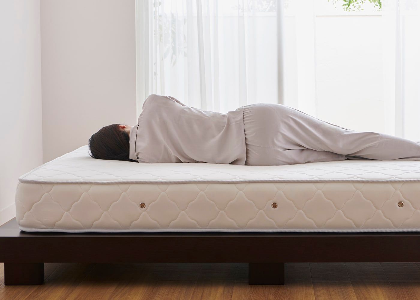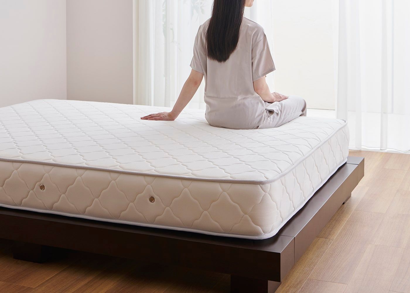 コト・ローベッドv01にダブル(ハード)を置いたイメージ。(マットレス上面高さ=245mm。モデルは身長167cmの女性)