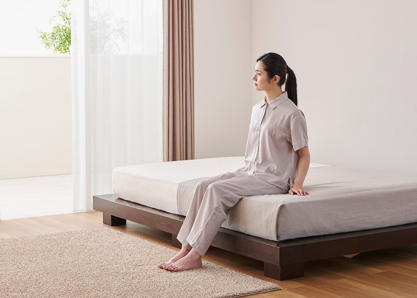 コト・ローベッドv02にダブル(ハード)を置いたイメージ。(マットレス上面高さ=245mm。モデルは身長167cmの女性)