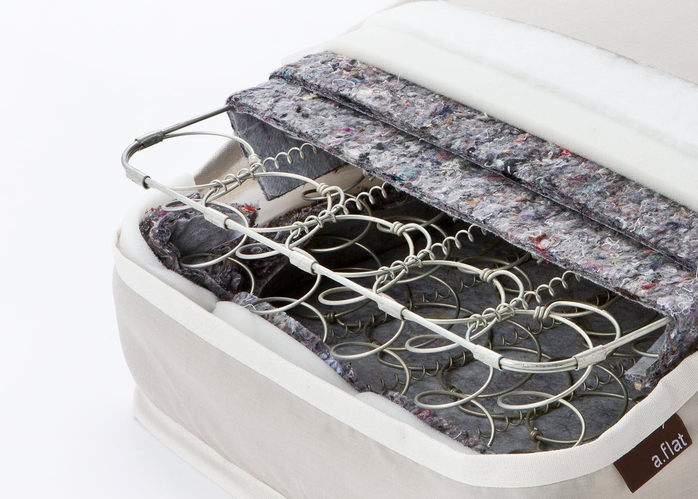 a.flatのマットレスは国内にある製品安全協会認定、「SGマーク取得工場」にて生産しています。日本人の身体と気候に合った高性能オリジナルマットレスを、徹底した品質管理のもとに開発しました。(写真はダブルサイズ)