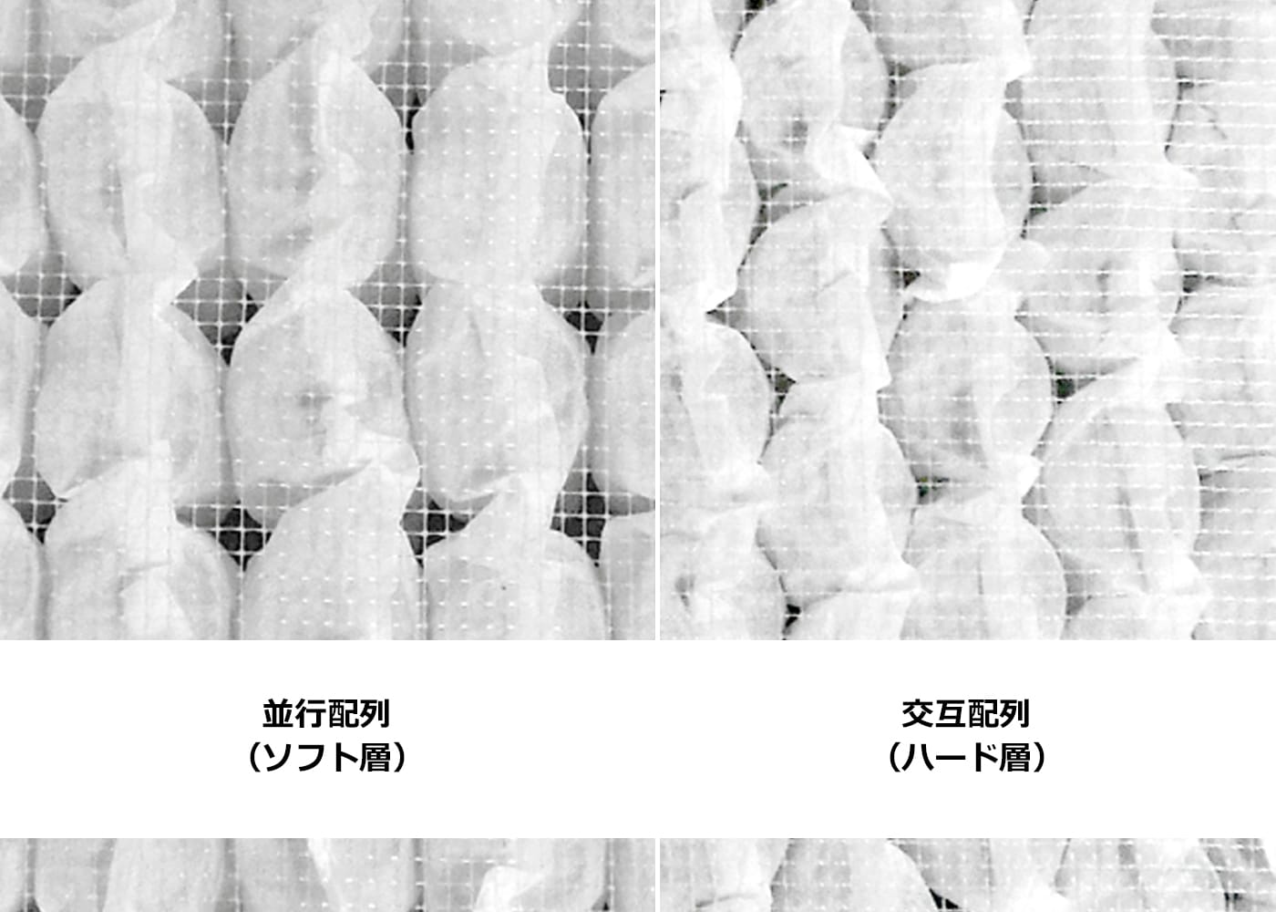 体の部位に合わせて、並行配列(ソフト層)と交互配列(ハード層)を組み合わせた、肩や腰の負担を軽減するマットレスです。
