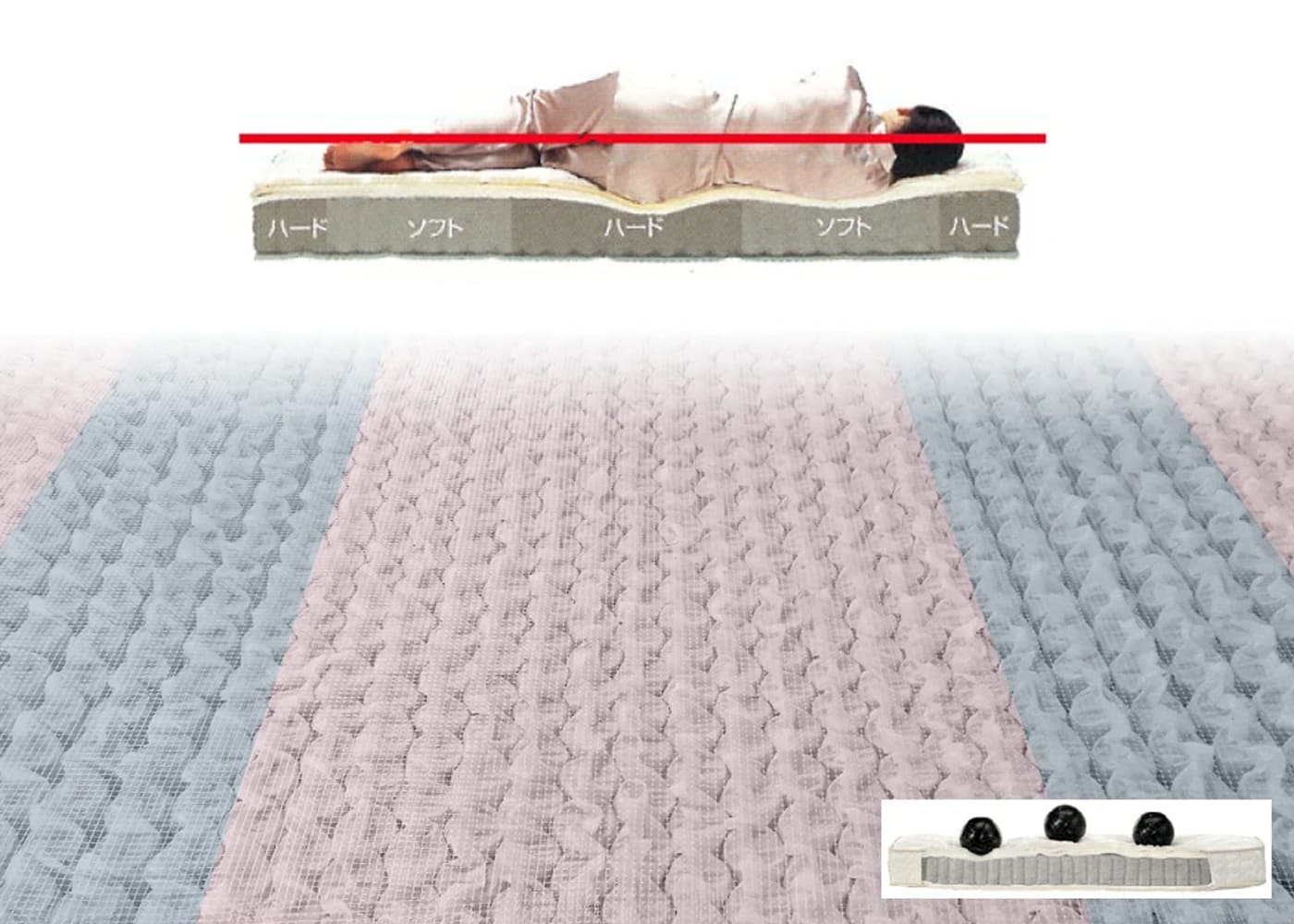 体の部位に合わせて、ソフト層(並行配列)とハード層(交互配列)と5ゾーンに分かれていることで、より理想的な寝姿勢を保つクッション性を実現しています。