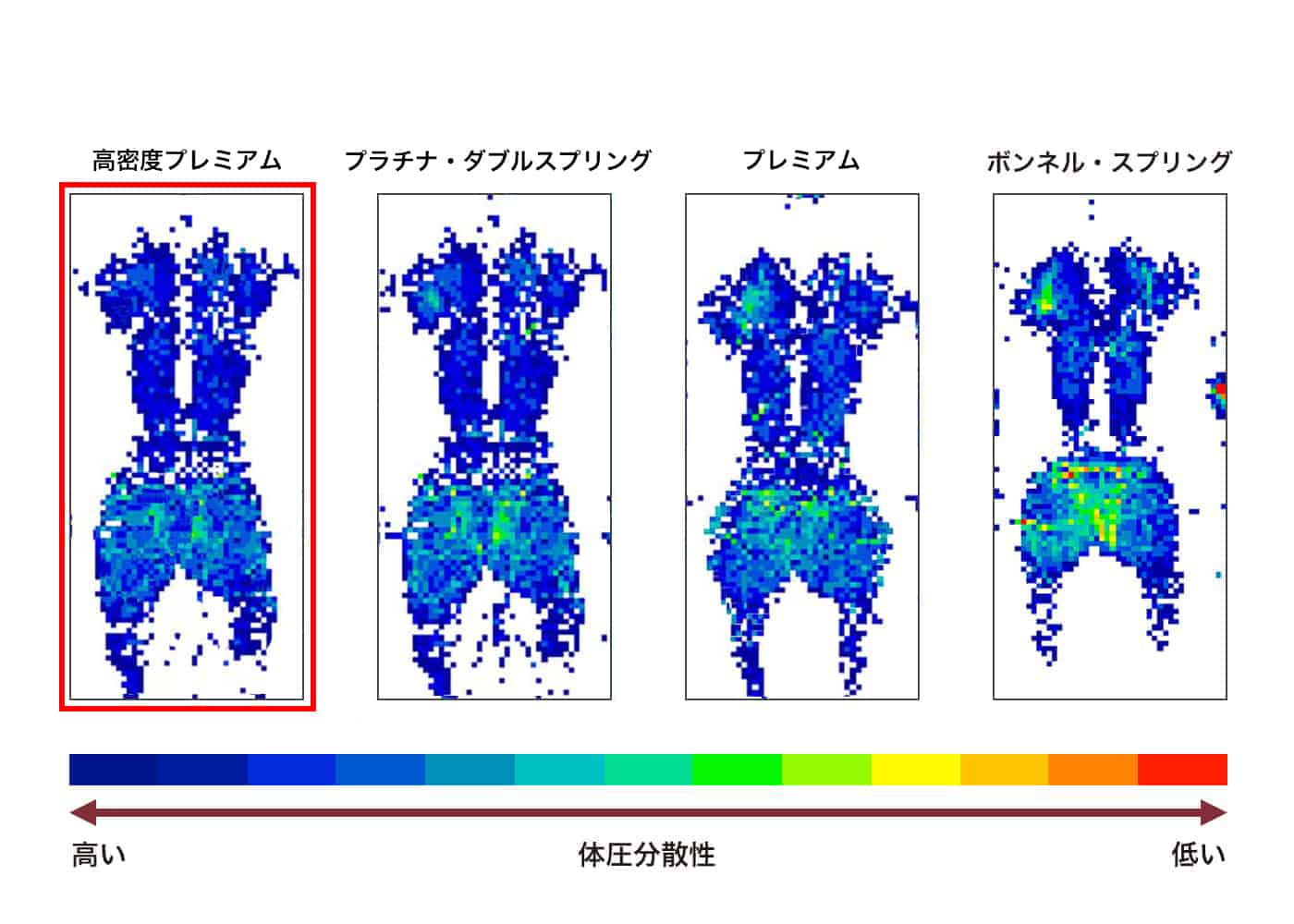 人が寝そべったときの体圧分散の度合いを示しています。赤や黄色の部分が少ないほど、また緑や青の部分が多いほど体圧分散性に優れています。高密度プレミアム・ポケットの高い体圧分散性が証明されています。