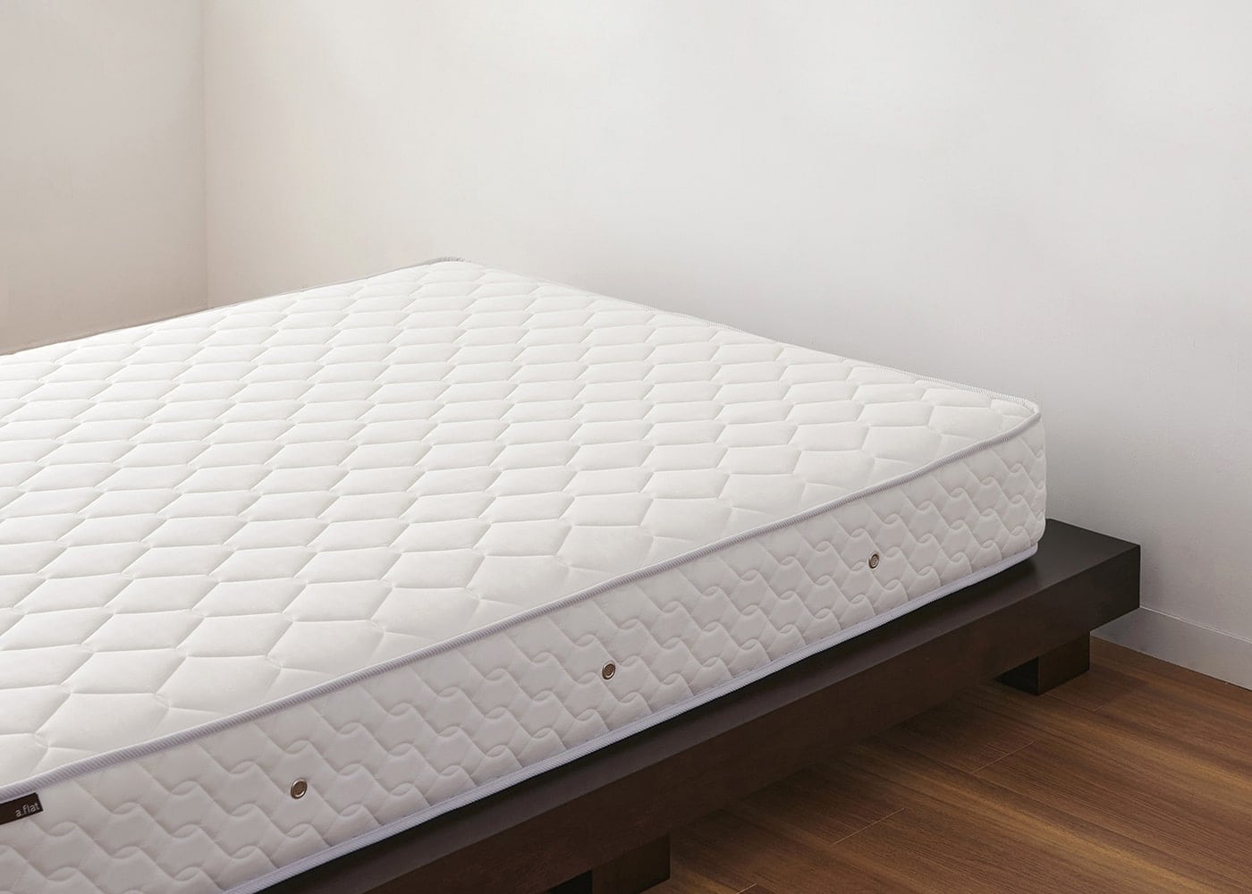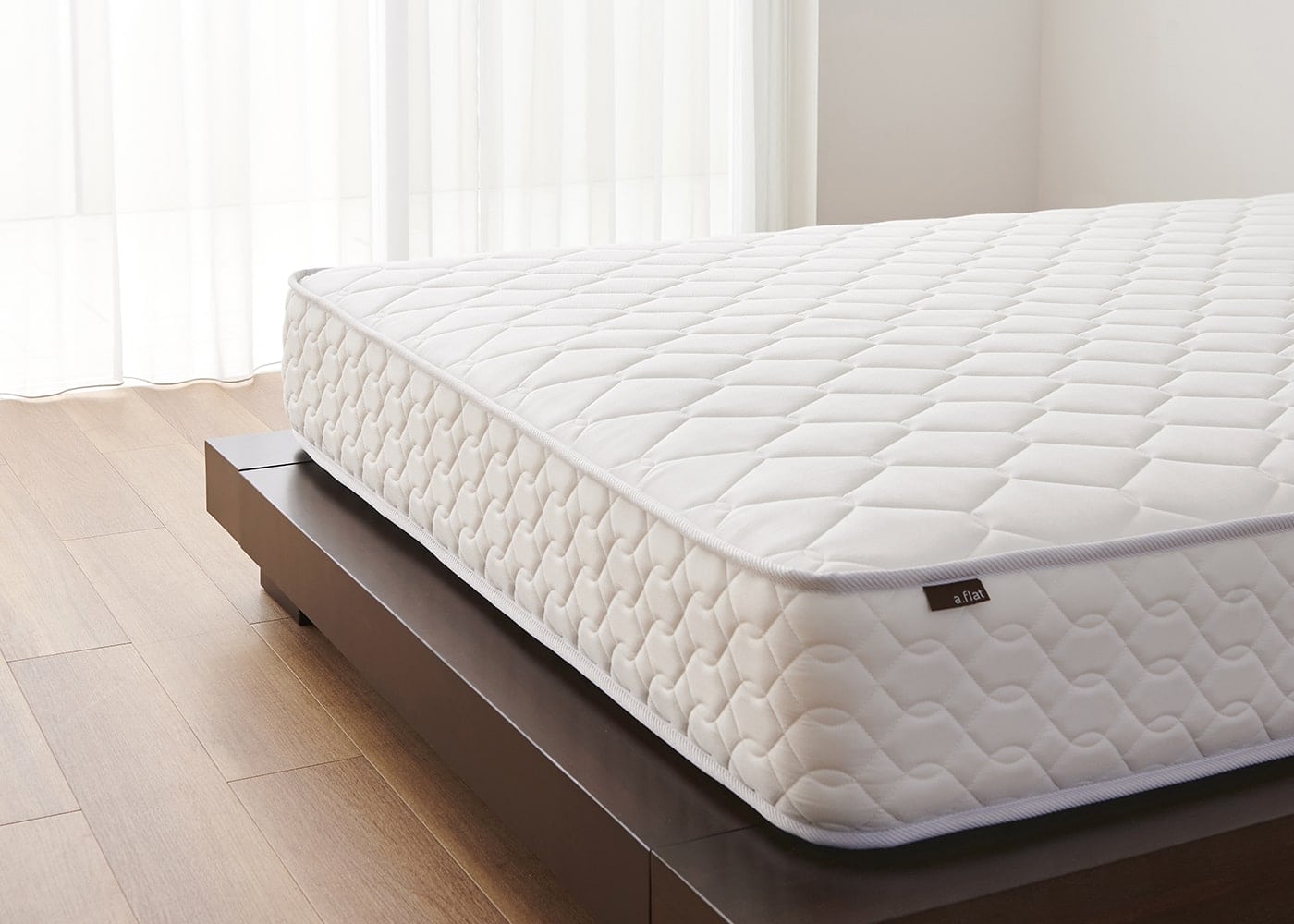 a.flatのマットレスは国内にある製品安全協会認定、「SGマーク取得工場」にて生産しています。日本人の身体と気候に合った高性能オリジナルマットレスを、徹底した品質管理のもとに開発しました。(写真はダブルサイズ)
