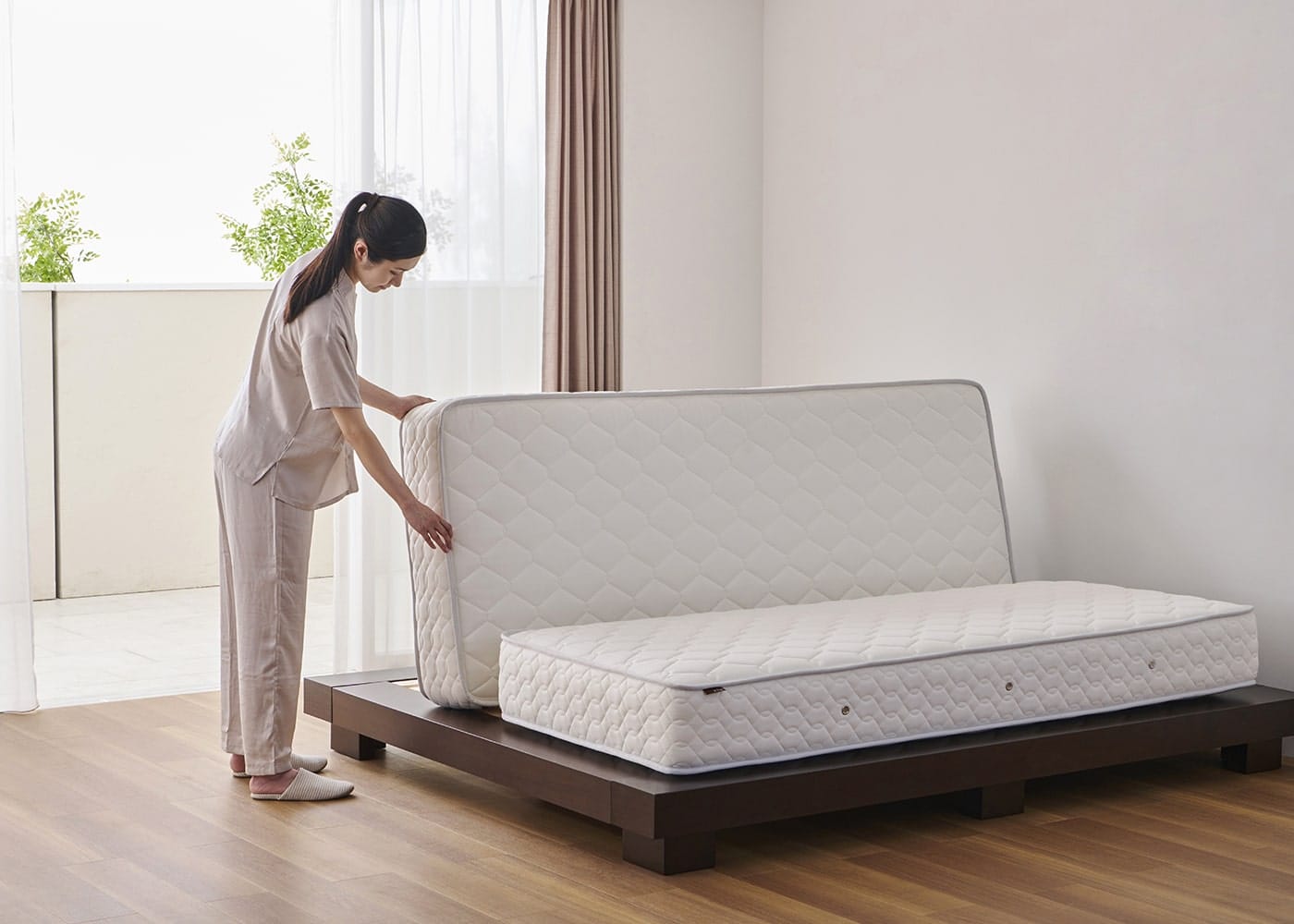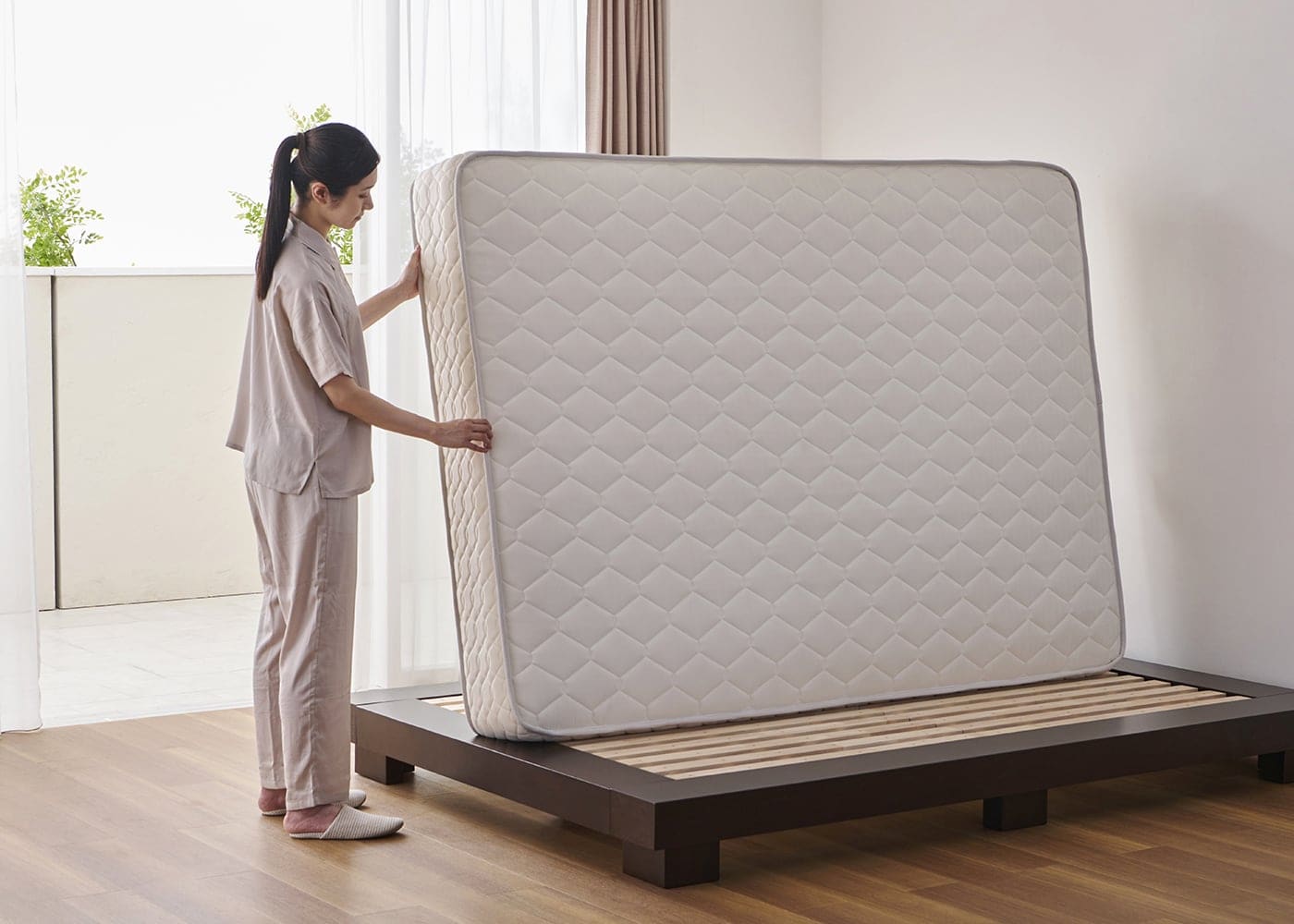 ハーフタイプのマットレスは分割されていることによって、女性の方でも動かしやすいメリットも有ります。表裏や上下の位置を変えたい時、シーツ交換などの際にも便利です。