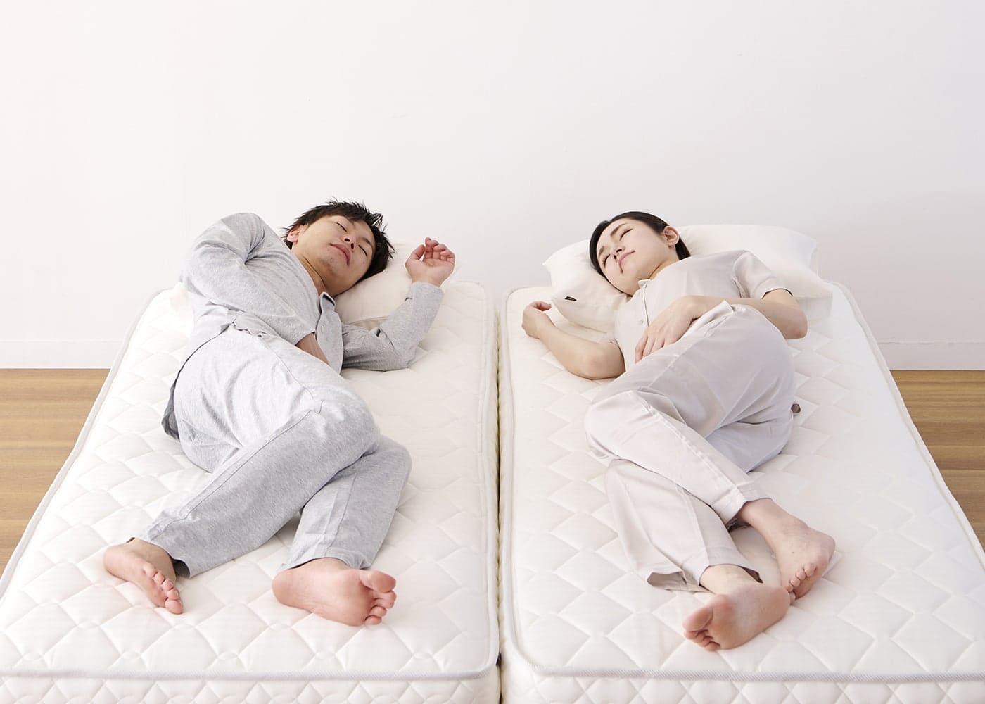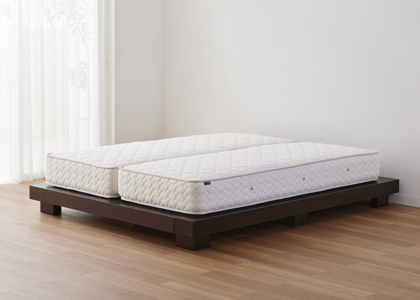 ハーフタイプを使用するメリットとして「搬入がしやすい」、「寝返りをしても振動が伝わりにくい」、「各自が異なる硬さを選べる」などが挙げられます。金額は少し割高になりますが、住居やライフスタイルに合わせてお選びください。(写真のサイズはクイーン ハーフ×2、硬さは左右ともにハード)