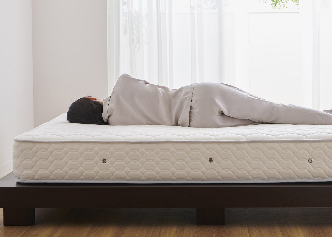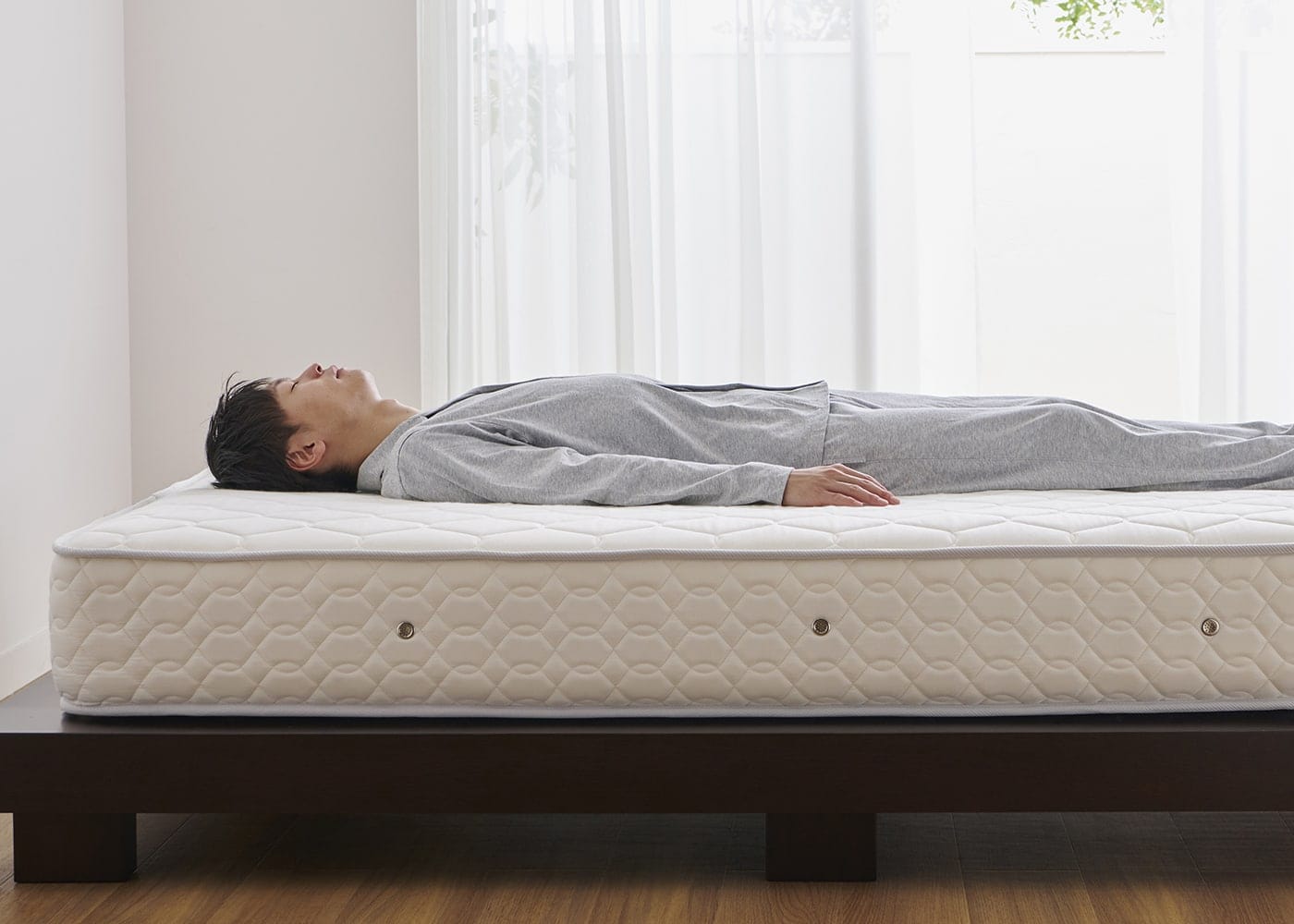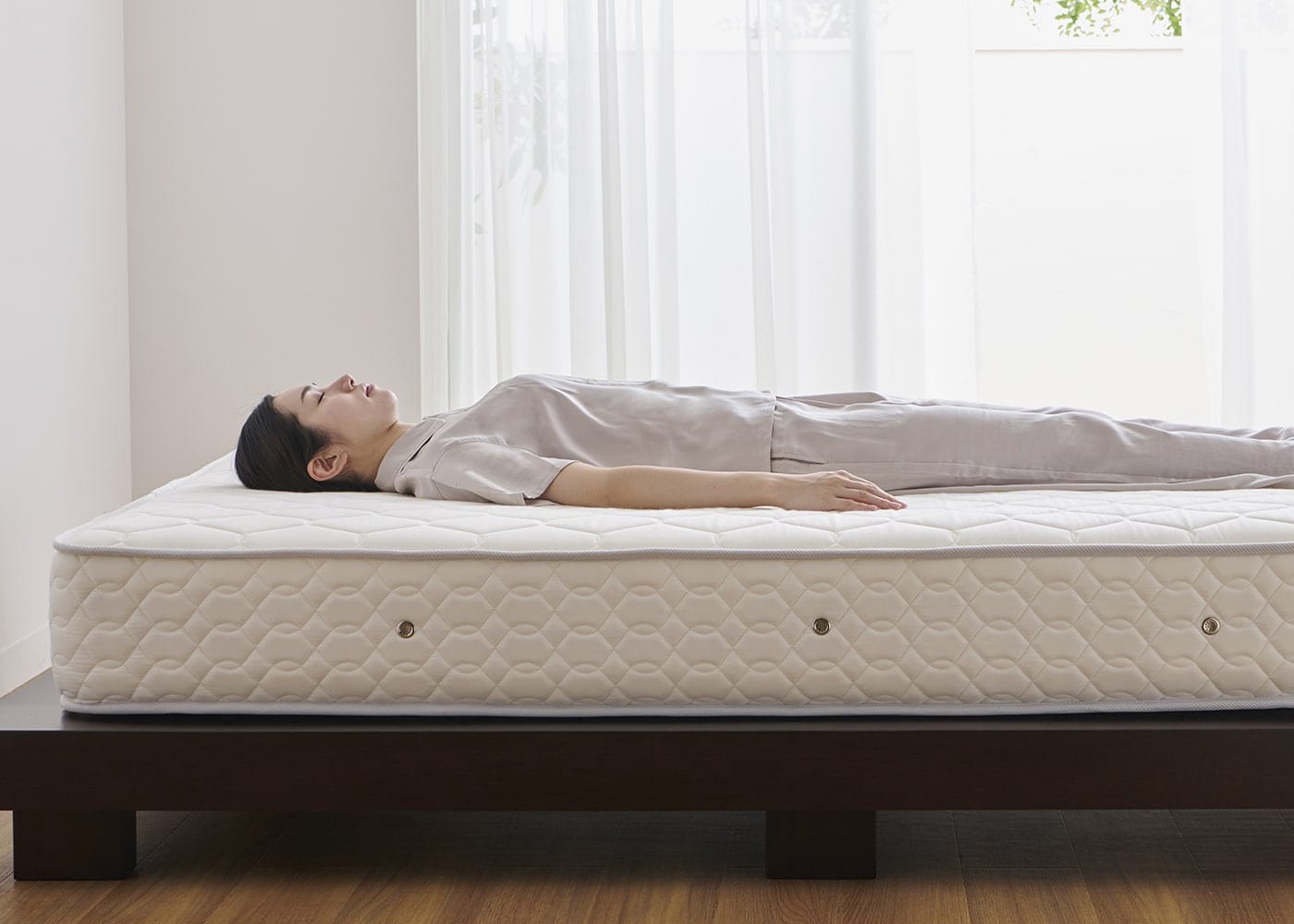 高密度プレミアム・ポケットコイル・マットレスは身体の凹凸に合わせて、無数のコイルが支えてくれる体圧分散性に優れたシリーズです。快眠にこだわりたい方からたくさんの支持を得ている、体圧分散性に最も優れたマットレスになります。(写真のマットレス硬さはハード。モデルは伸長167cm、体重49kgの女性。仰向けの状態)