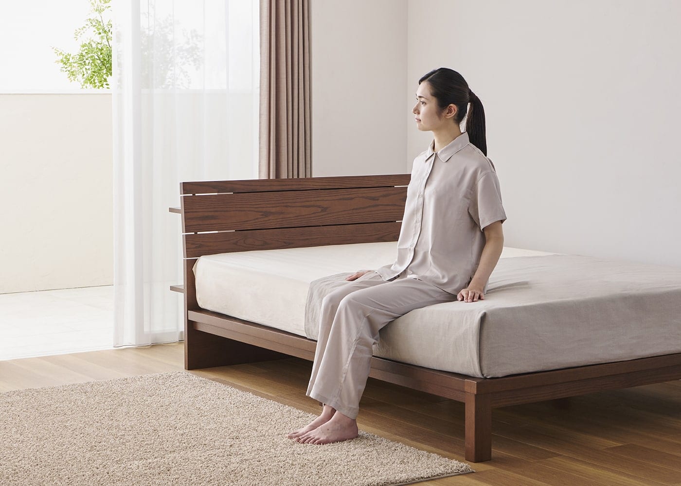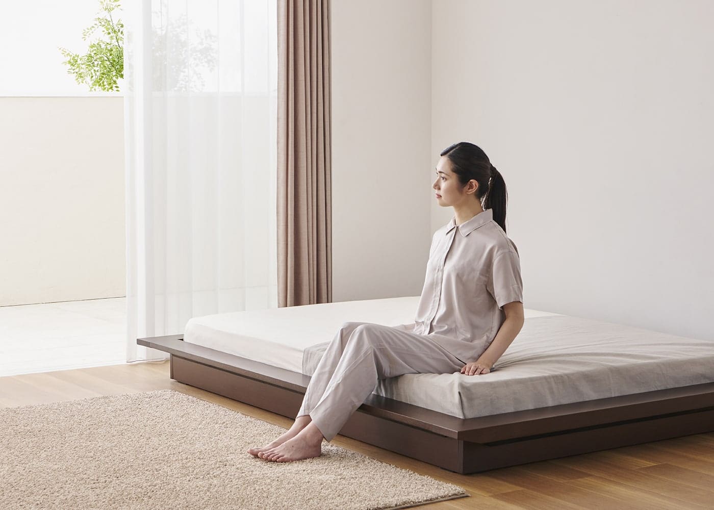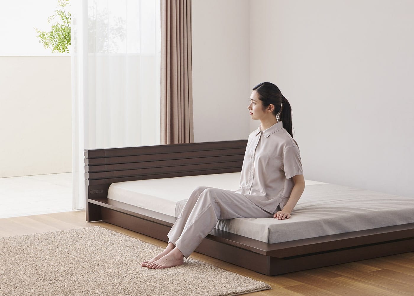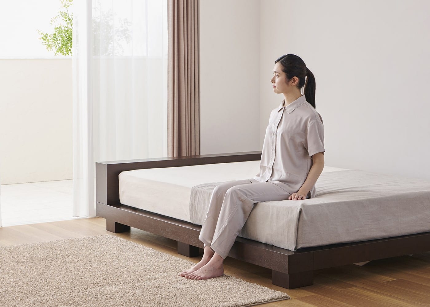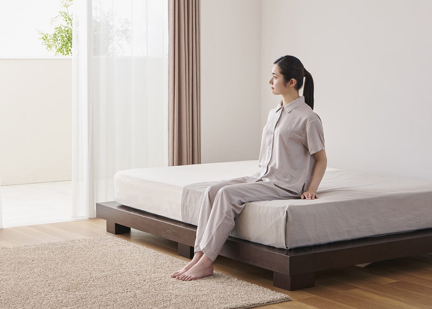 コト・ローベッドv01にダブル(ハード)を置いたイメージ。(マットレス上面高さ=270mm。モデルは身長167cmの女性)
