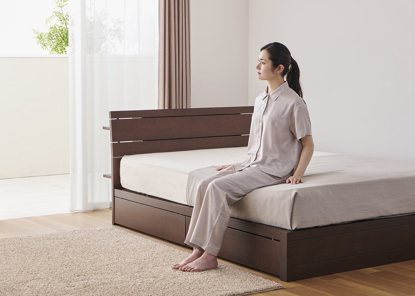ムク・ベッドにダブル(ハード)を置いたイメージ。マットレス上面高さ=505mm。モデルは身長167cmの女性)