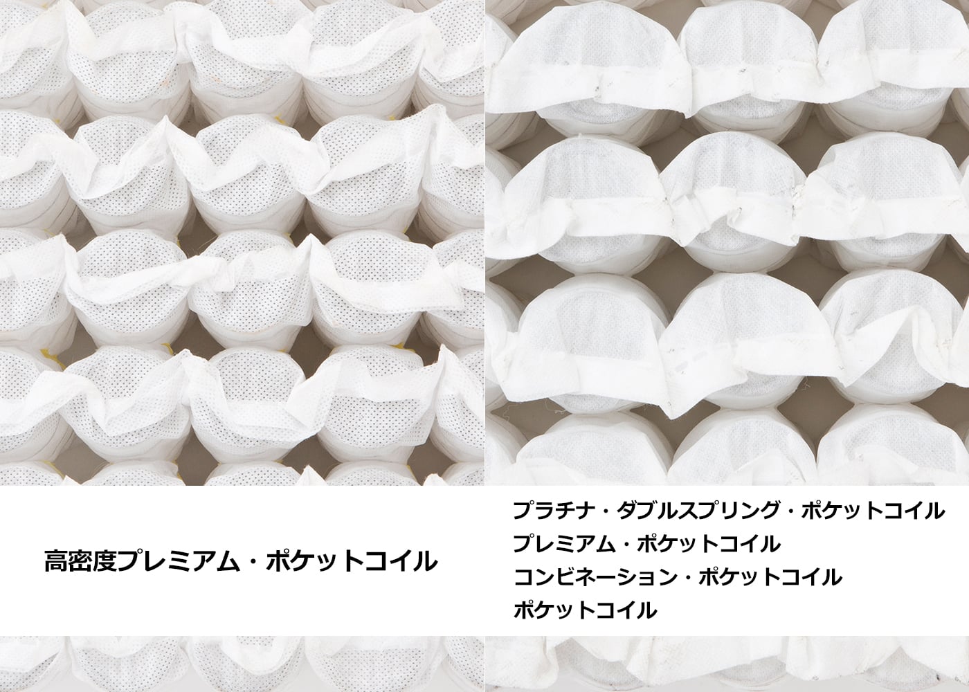 コイル径も標準のポケットコイルに比べ約40mmと10mmも細く、コイル数も標準と比べて約2倍のコイル数のため、体圧分散性に最も優れています。(例:高密度ダブルのコイル数=1496個、標準ダブルのコイル数=775個)