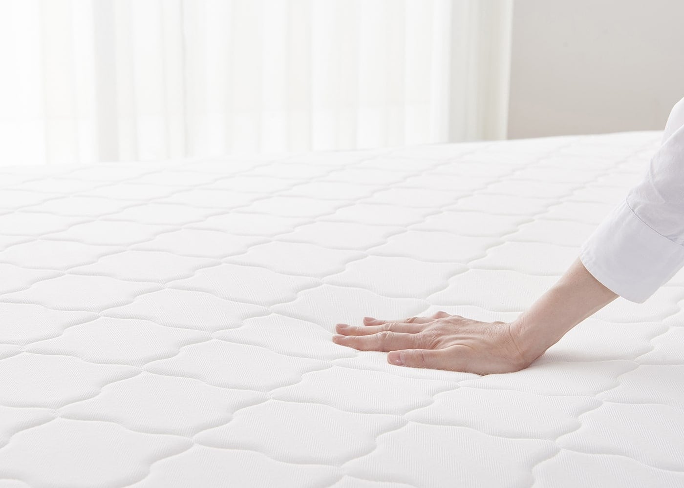長く使えるマットレスの条件として、表面の詰め物の適度な厚みが挙げられます。ほどよい感触の詰め物が硬すぎず柔らかすぎない寝心地を実現しました。(写真の硬さはハード)