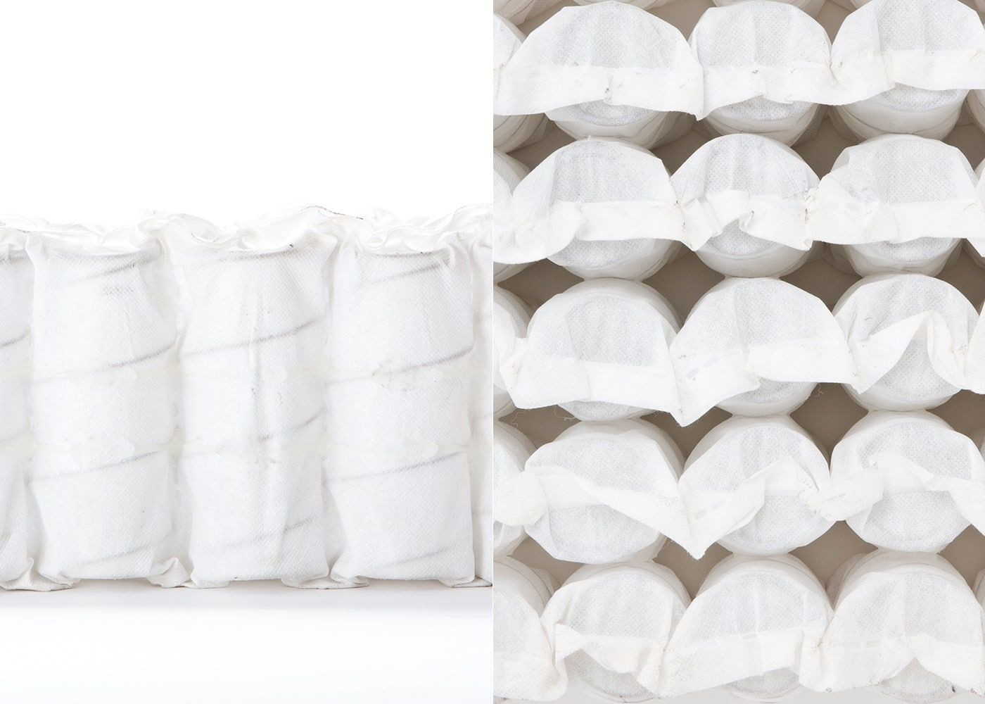 写真左:コイルを圧縮し、通気性のある不織布のポケット(袋)に1つ1つ包んであります。コイルの高さは約140mm。写真右:独立したコイルを敷き詰めた構造です。コイルの直径は約50mm。(※マットレスの内部構造や生地はポケットコイル・マットレスと同様になります)