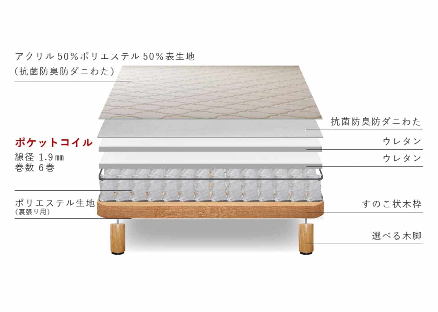 脚付きポケットコイル・マットレスの内部構造です。耐久性が高く通気性の優れた木枠の土台をベースに、ポケットコイルや複数層で構成された中材が快適な寝心地を実現してくれます。また、搬入出がしやすいよう木脚部分は取り外し可能なため安心です。