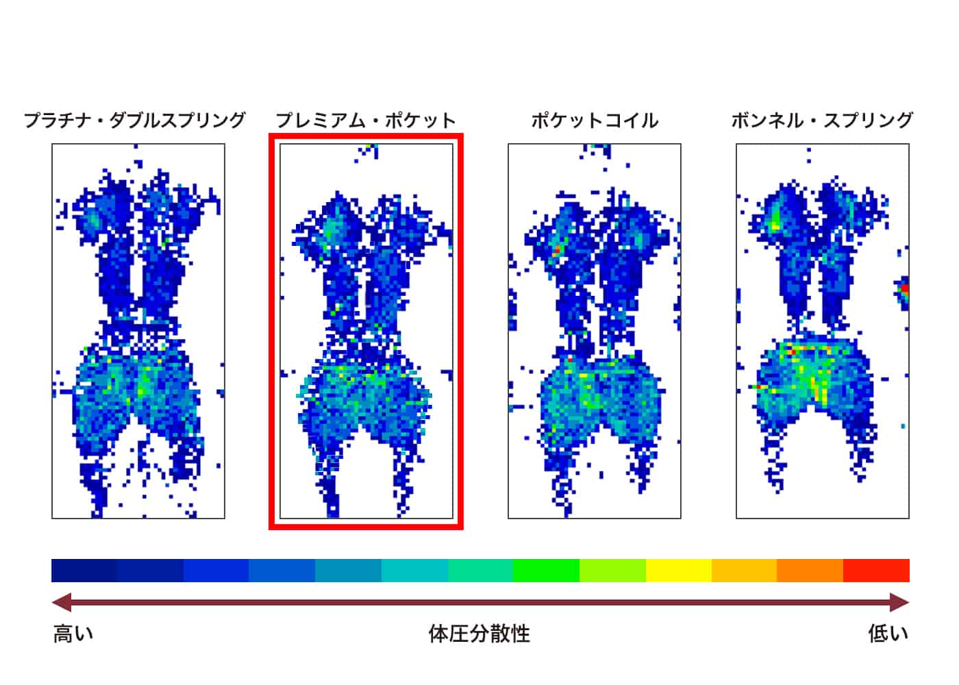 人が寝そべったときの体圧分散の度合いを示しています。赤や黄色の部分が少ないほど、また緑や青の部分が多いほど体圧分散性に優れています。プレミアム・ポケットの高い体圧分散性が証明されています。