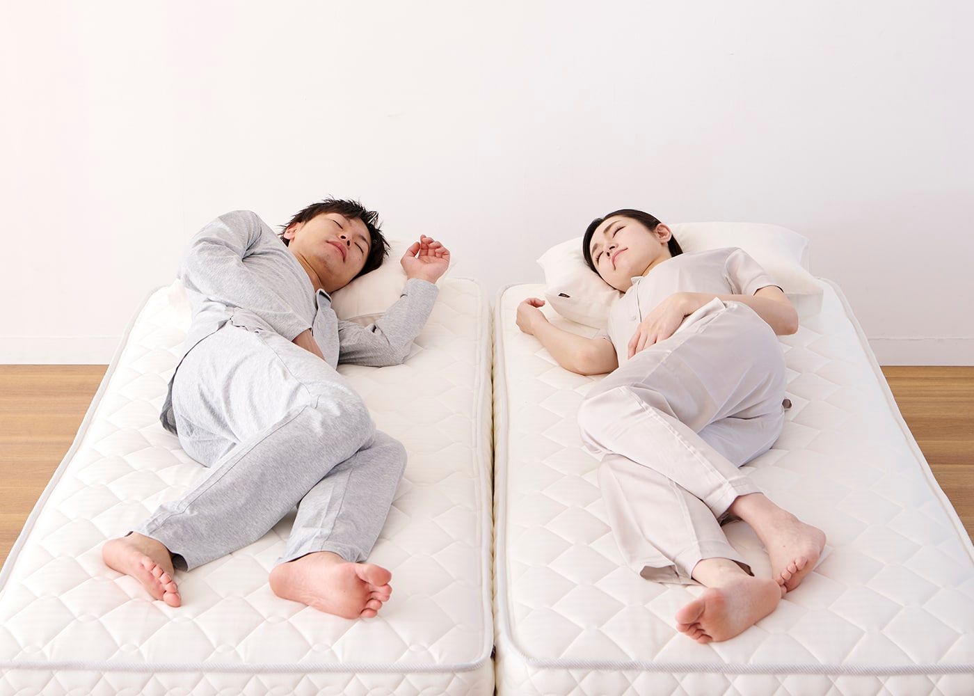 「理想的な寝姿勢」を保つためには、体重に合わせた最適なマットレスの硬さを選ぶことが重要です。ノーマル、ハードタイプの2種類からお選び下さい。※写真のマットレスはハード(ダブル)