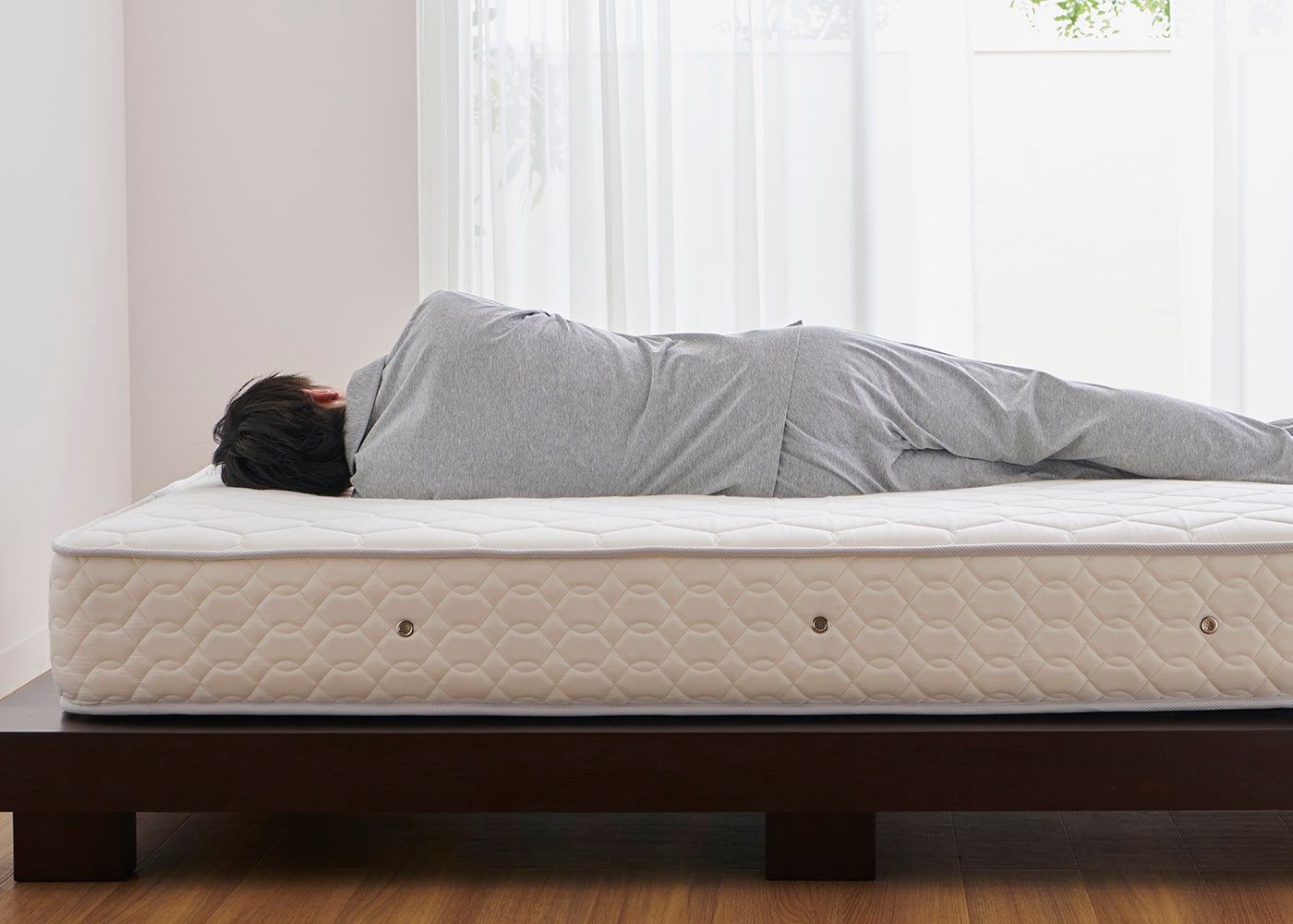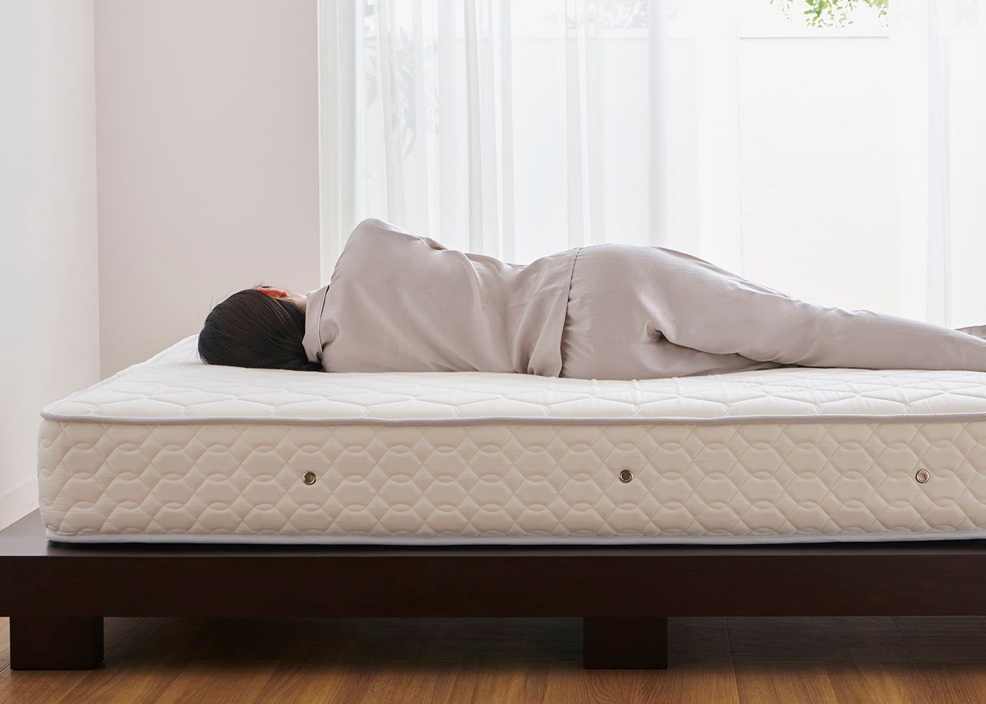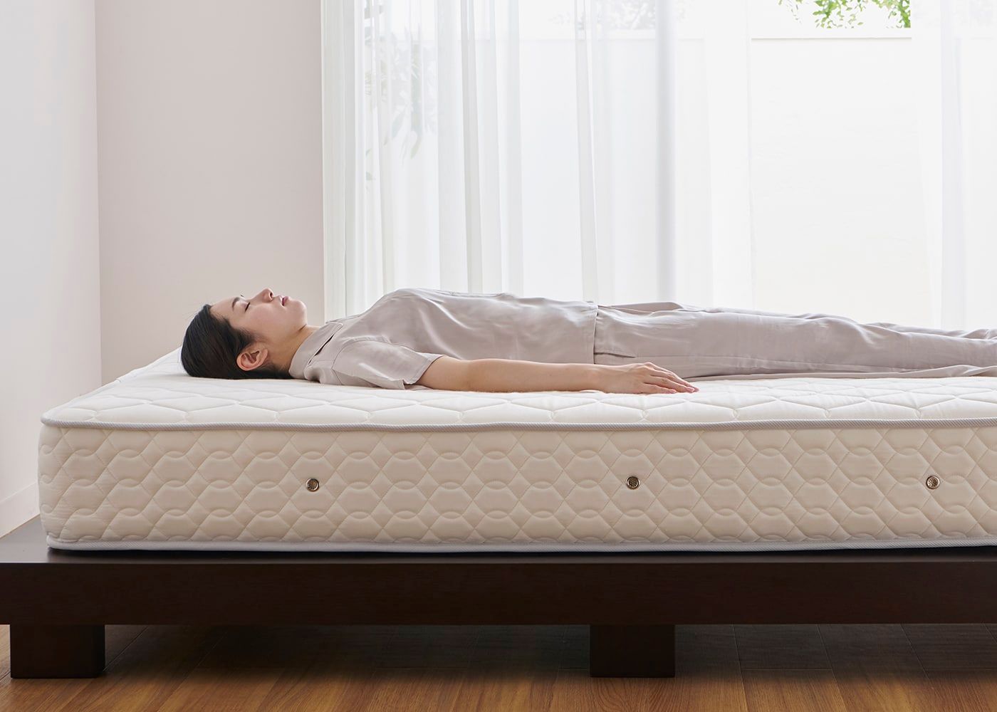 プレミアム・ポケットコイル・マットレスは身体の凹凸に合わせて、無数のコイルが支えてくれる体圧分散性に優れたシリーズです。快眠にこだわりたい方からたくさんの支持を得ている、ロングセラーマットレスになります。(写真のマットレス硬さはハード。モデルは伸長167cm、体重49kgの女性。仰向けの状態)