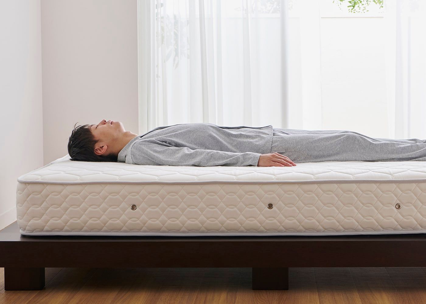 写真のマットレス硬さはハード。モデルは伸長171cm、体重60kgの男性。仰向けの状態。