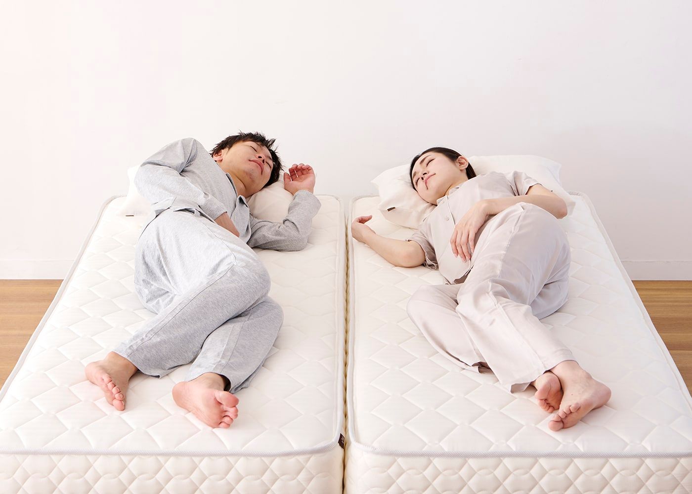 ハーフタイプを使用するメリットとして「搬入がしやすい」、「寝返りをしても振動が伝わりにくい」、「各自が異なる硬さを選べる」などが挙げられます。金額は少し割高になりますが、住居やライフスタイルに合わせてお選びください。(写真のサイズはクイーン ハーフ×2、硬さは左右ともにハード)